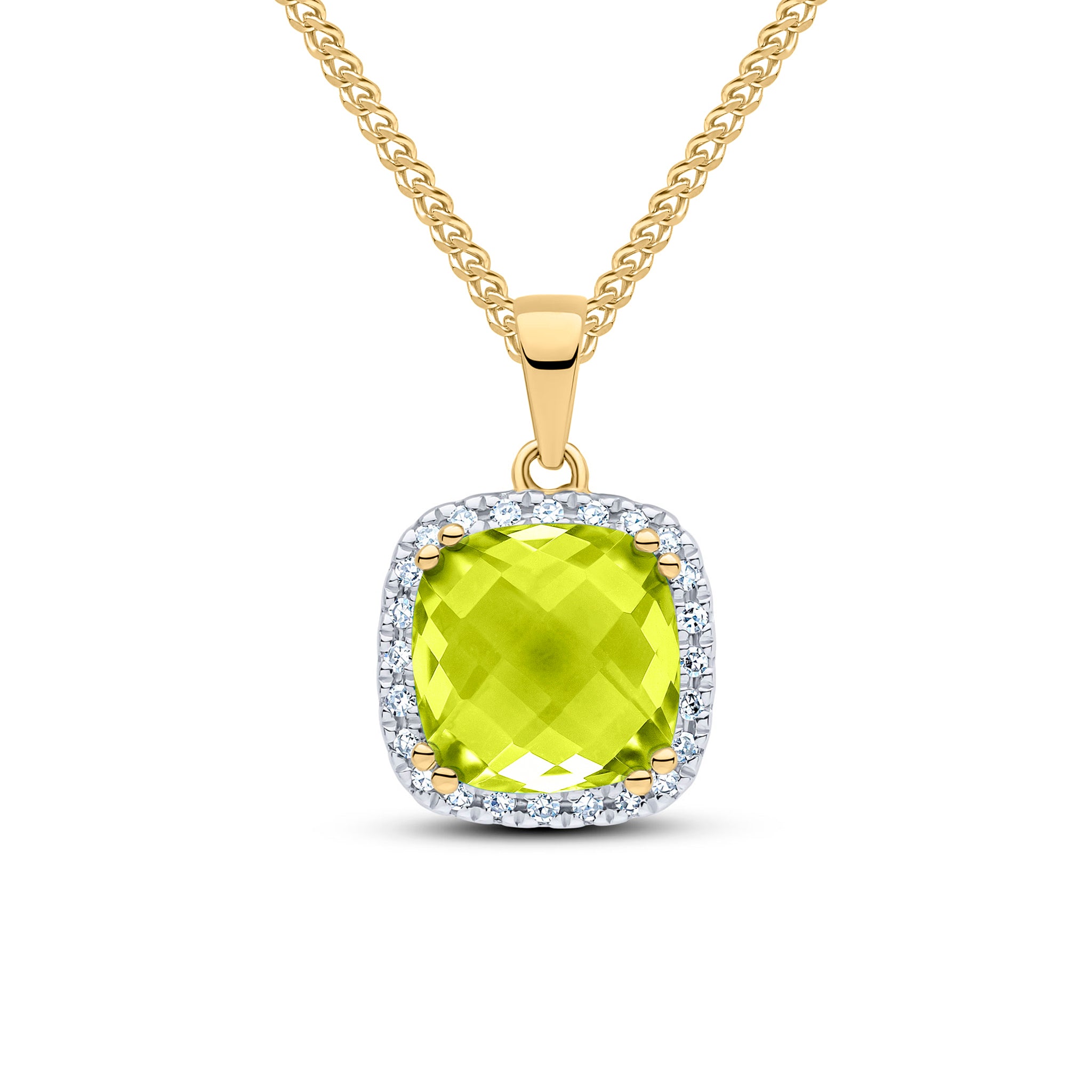 9CT Yellow Gold Cushion Peridot & Diamond Cluster Pendant 8mm