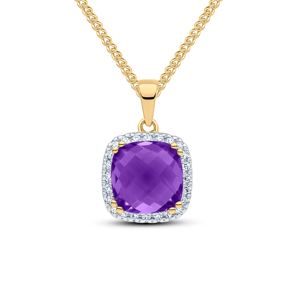 9CT Yellow Gold Cushion Amethyst & Diamond Cluster Pendant 8mm