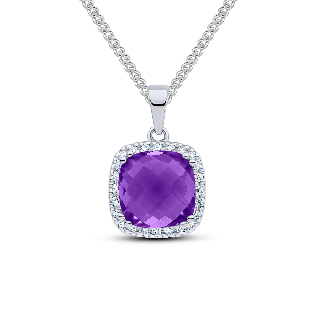 9CT White Gold Cushion Amethyst & Diamond Cluster Pendant 8mm