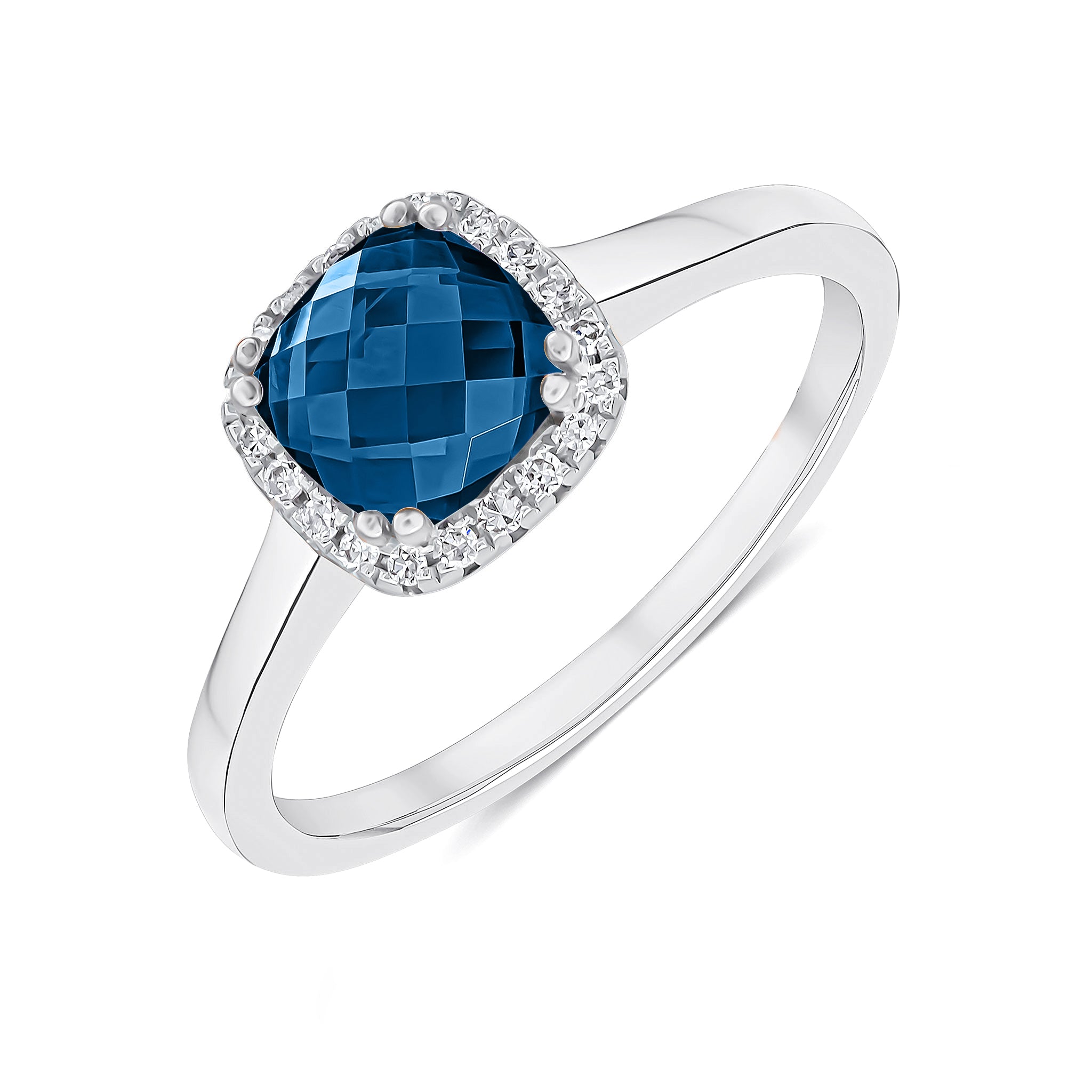 9CT White Gold Checkerboard Cut Cushion London Blue Topaz & Diamond Cluster Ring 6mm