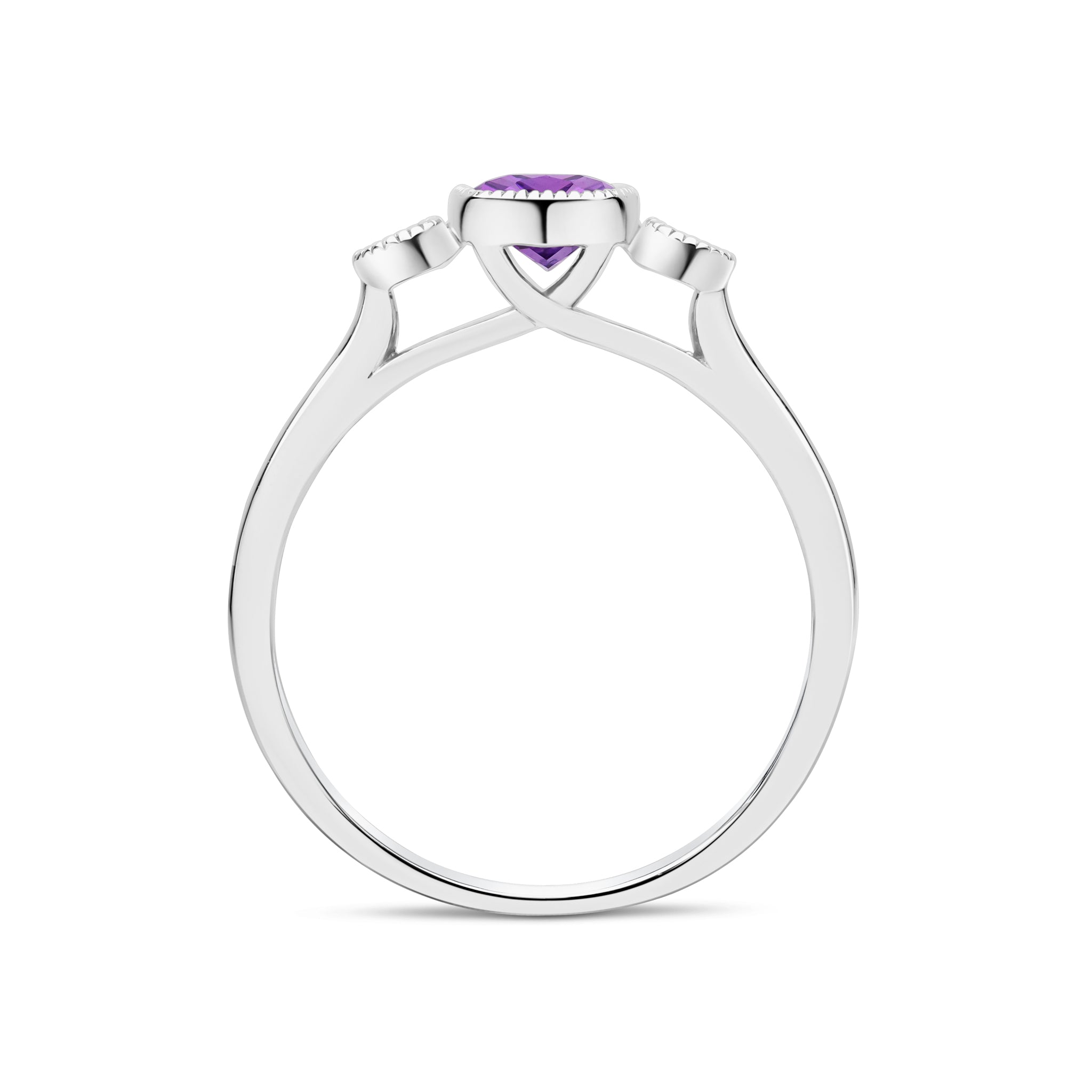 9CT White Gold Millegrain Octagonal Cushion Amethyst & Round Diamond Three Stone Ring 7x5mm