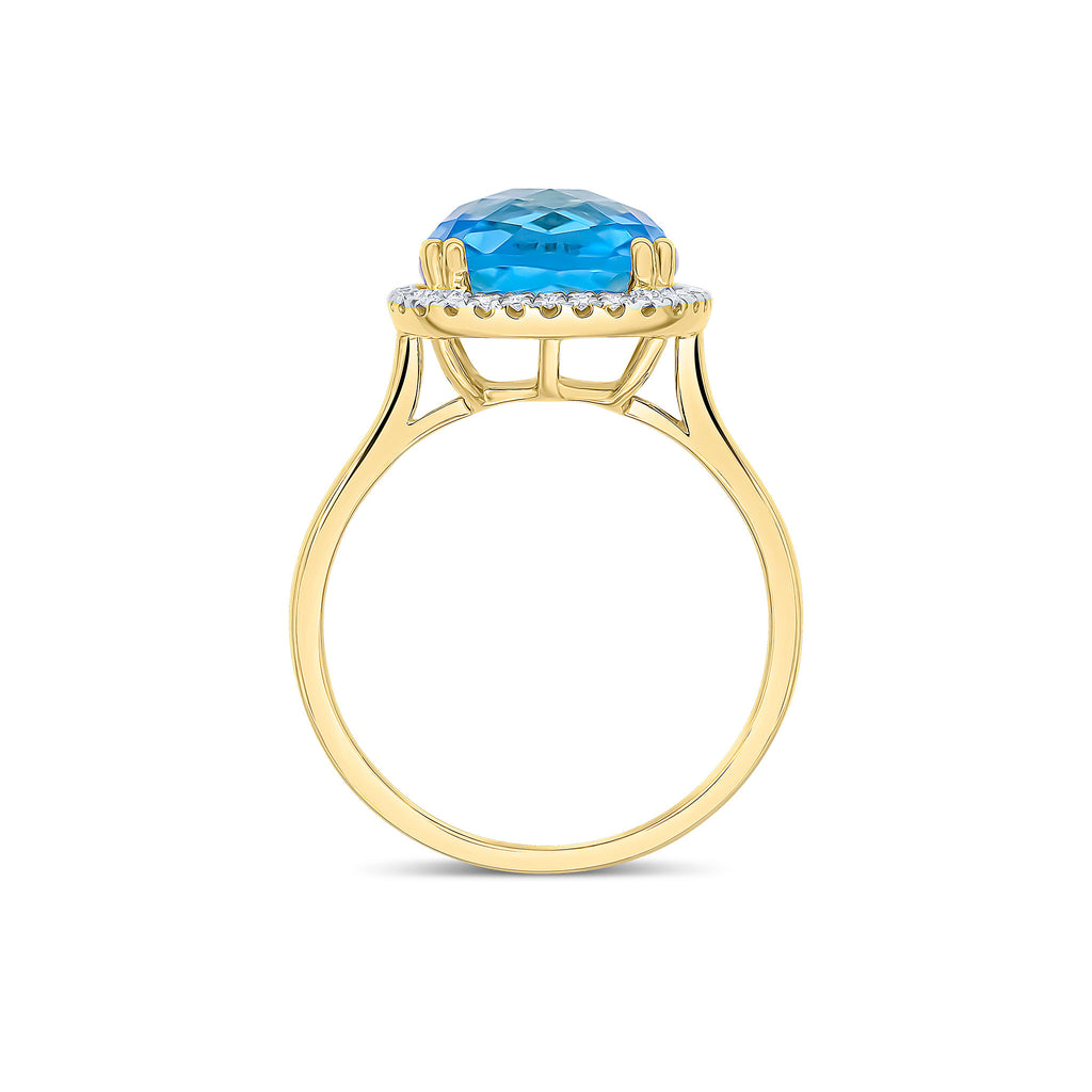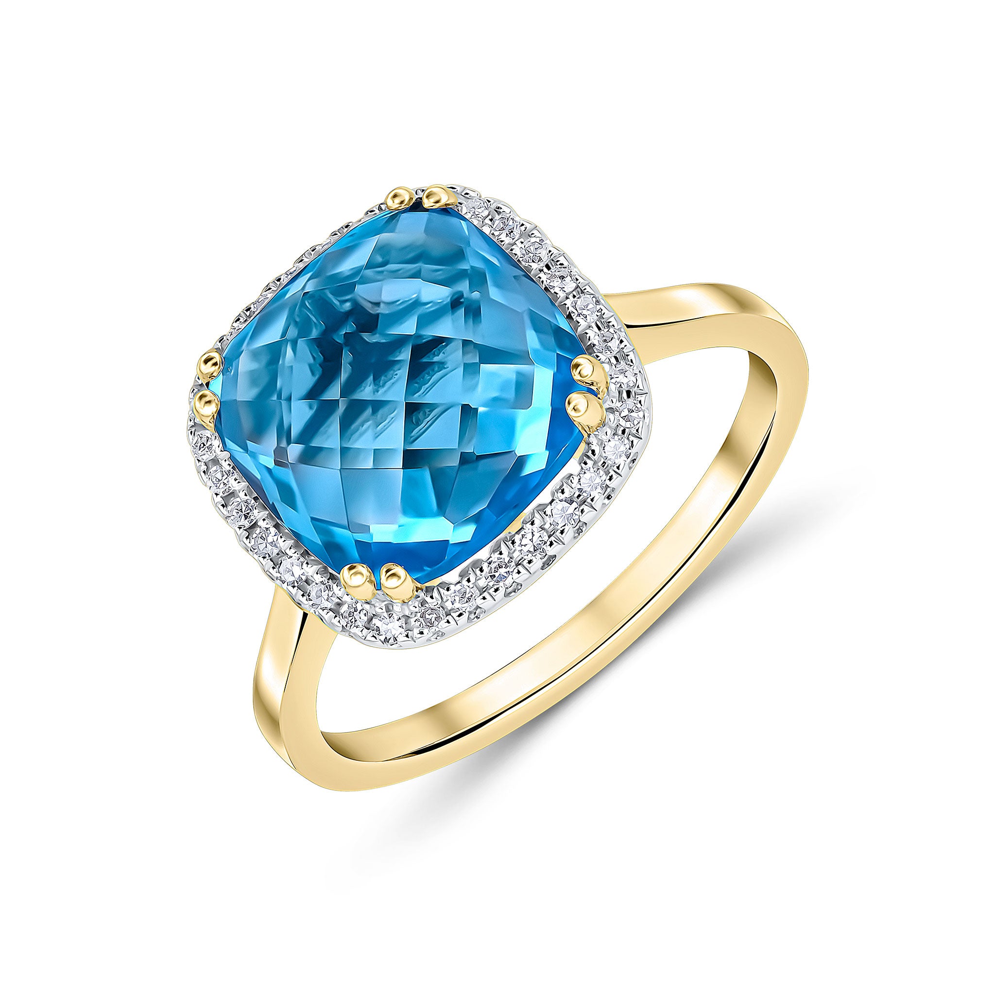 9CT Yellow Gold Cushion Swiss Blue Topaz & Diamond Cluster Ring 10mm