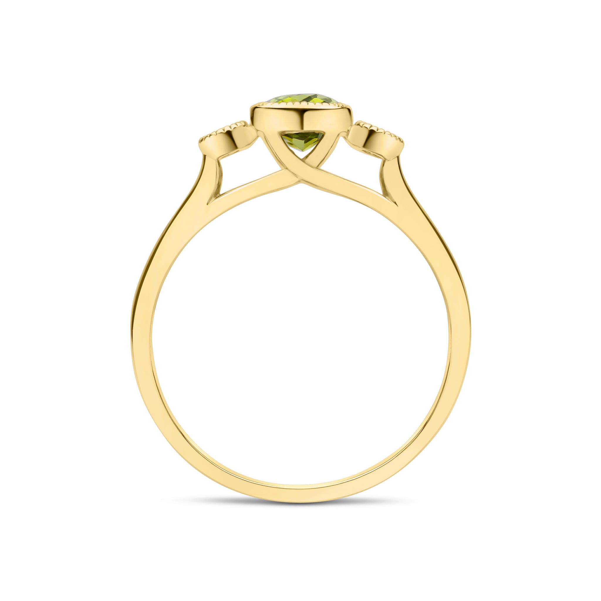 9CT Yellow Gold Millegrain Octagonal Cushion Peridot & Round Diamond Three Stone Ring 7x5mm