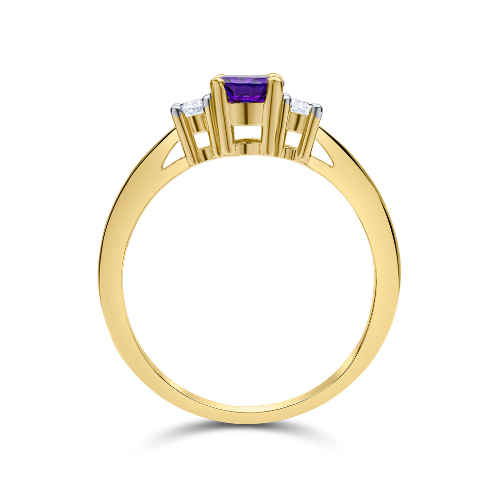 9CT Yellow Gold Oval Amethyst & Round Diamond 7x5mm Claw Set Three Stone Ring
