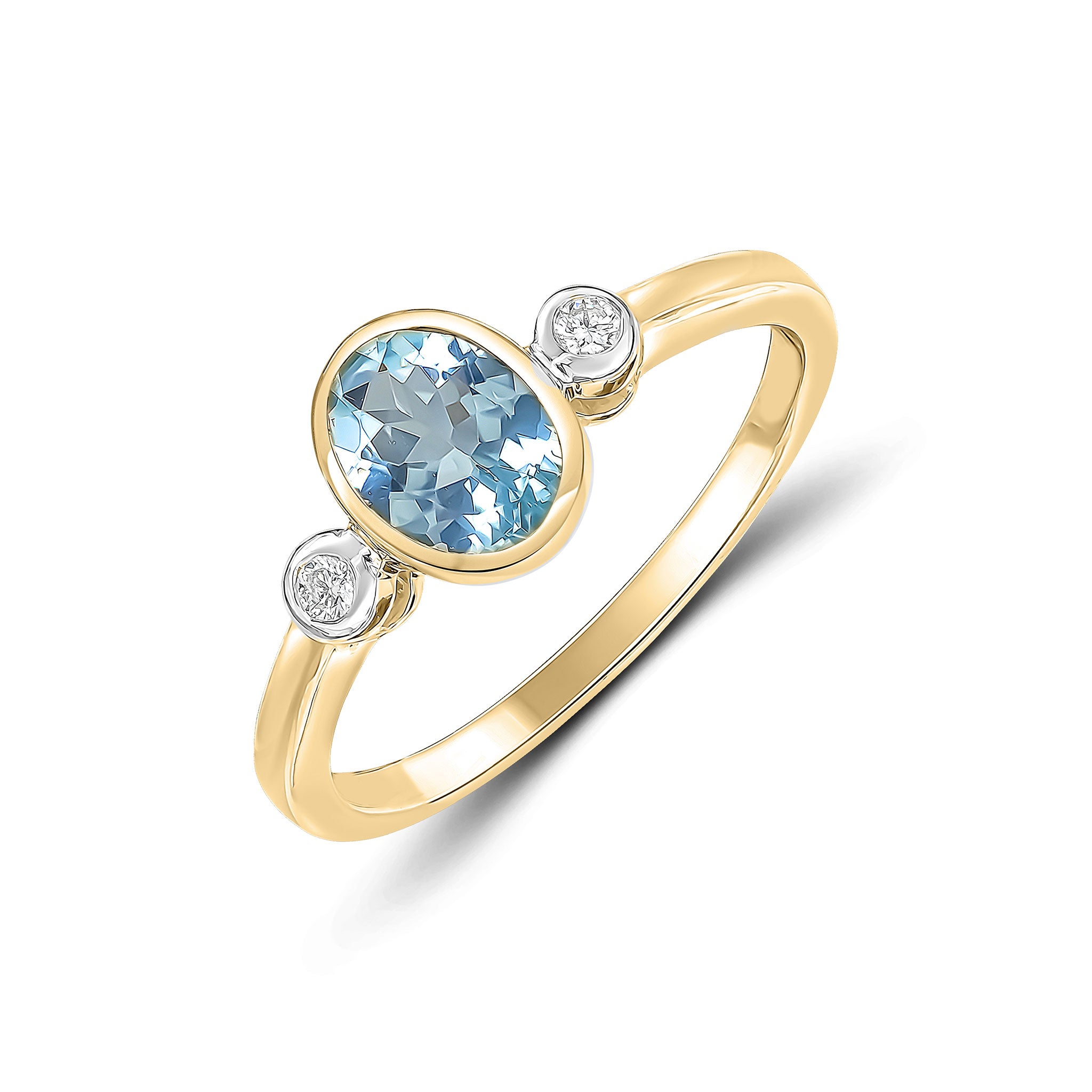 9CT Yellow Gold Oval Aquamarine & Diamond Three Stone Rubover Ring