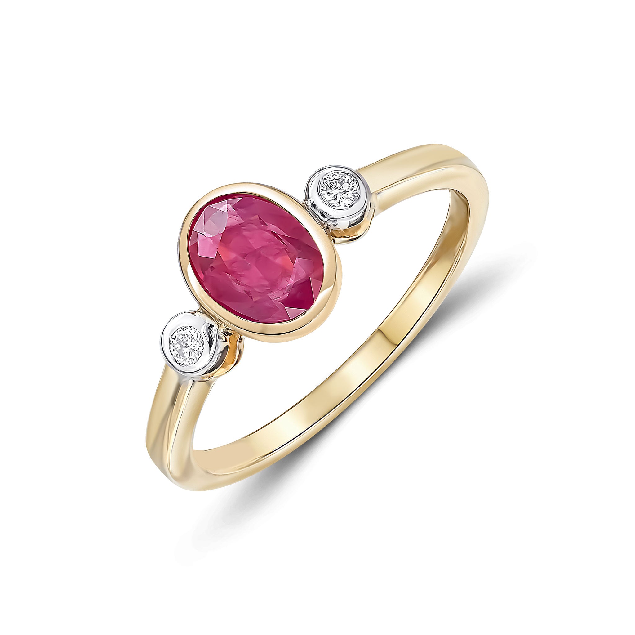 9CT Yellow Gold Oval Ruby & Diamond Three Stone Rubover Ring