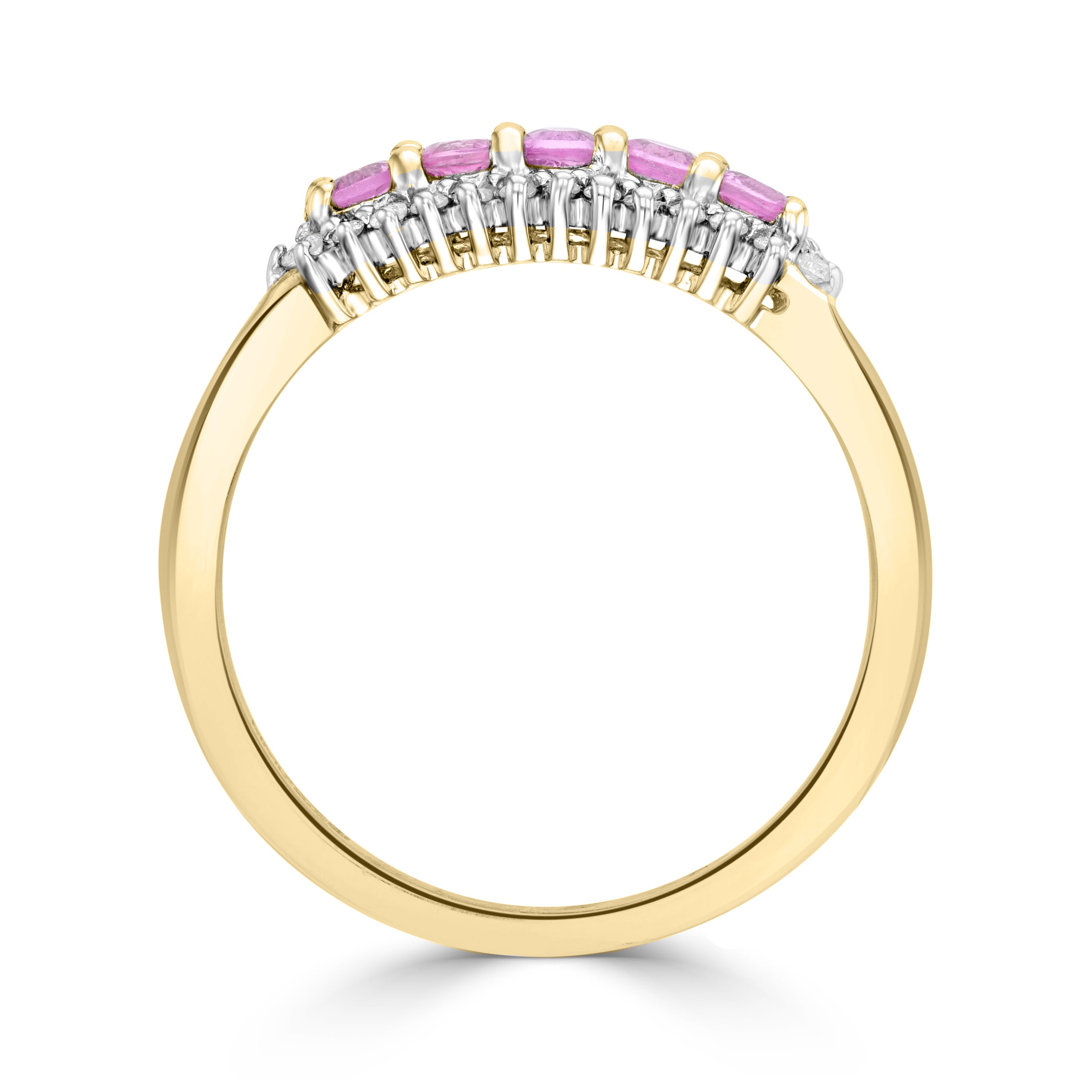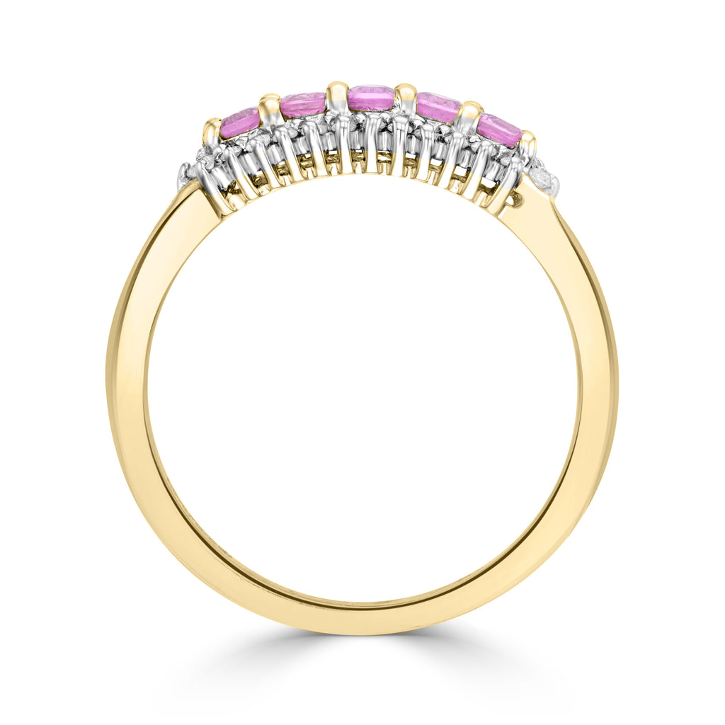 9CT Yellow Gold Round Pink Sapphire & Diamond 3 Row Ring