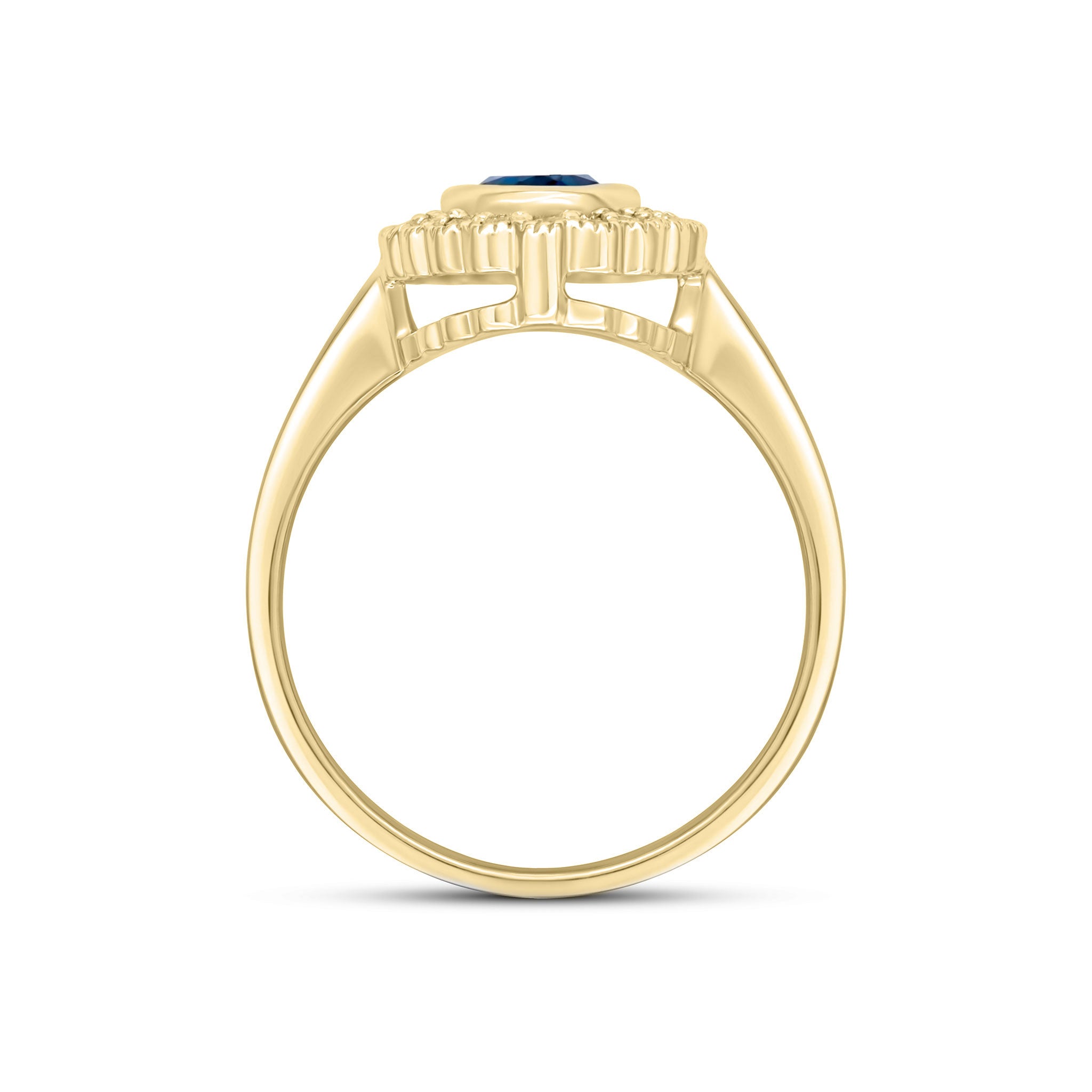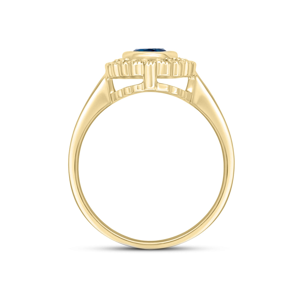 9CT Yellow Gold Rubover Oval London Blue Topaz & Millegrain Diamond Cluster Ring 7x5mm