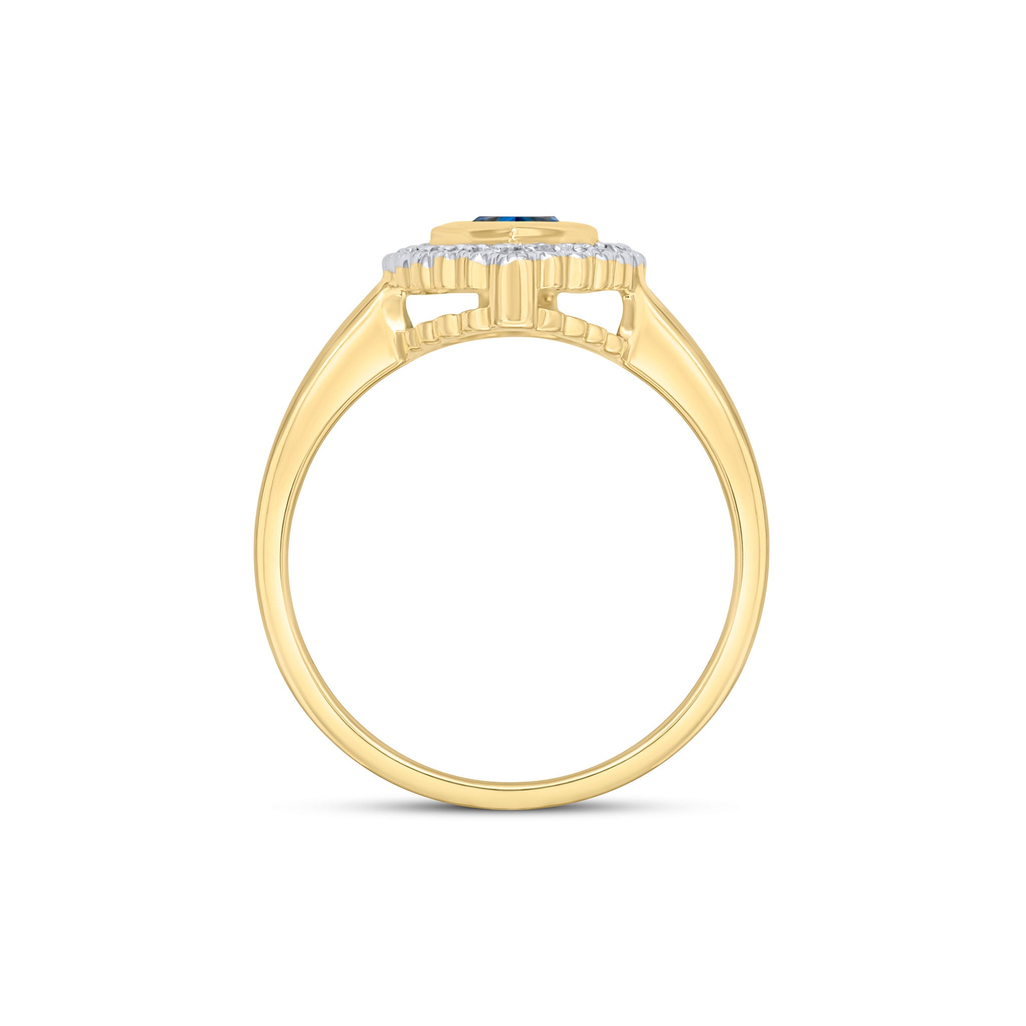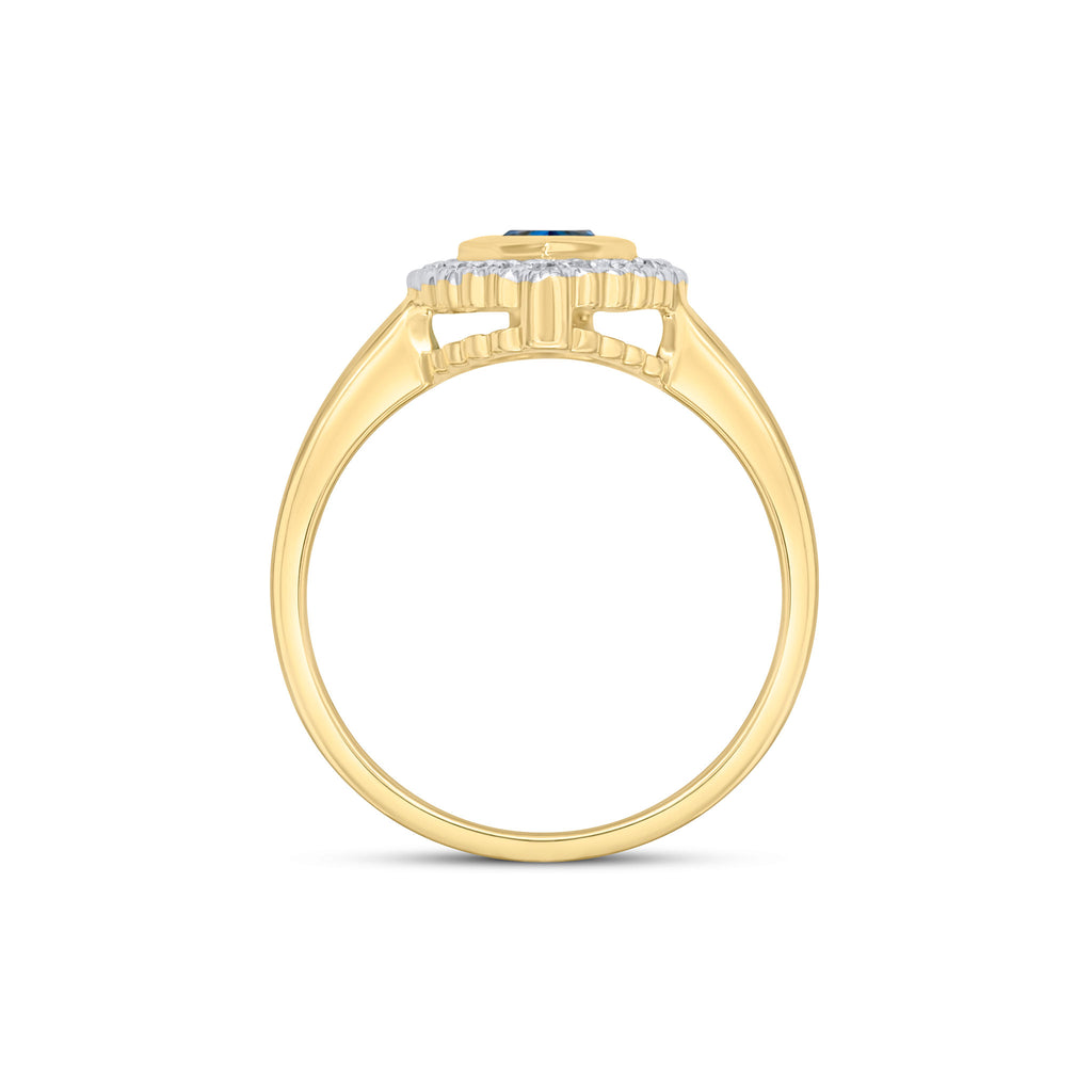 9CT Yellow Gold Rubover Pear Shaped Swiss Blue Topaz & Millegrain Diamond Cluster Ring 7x5mm