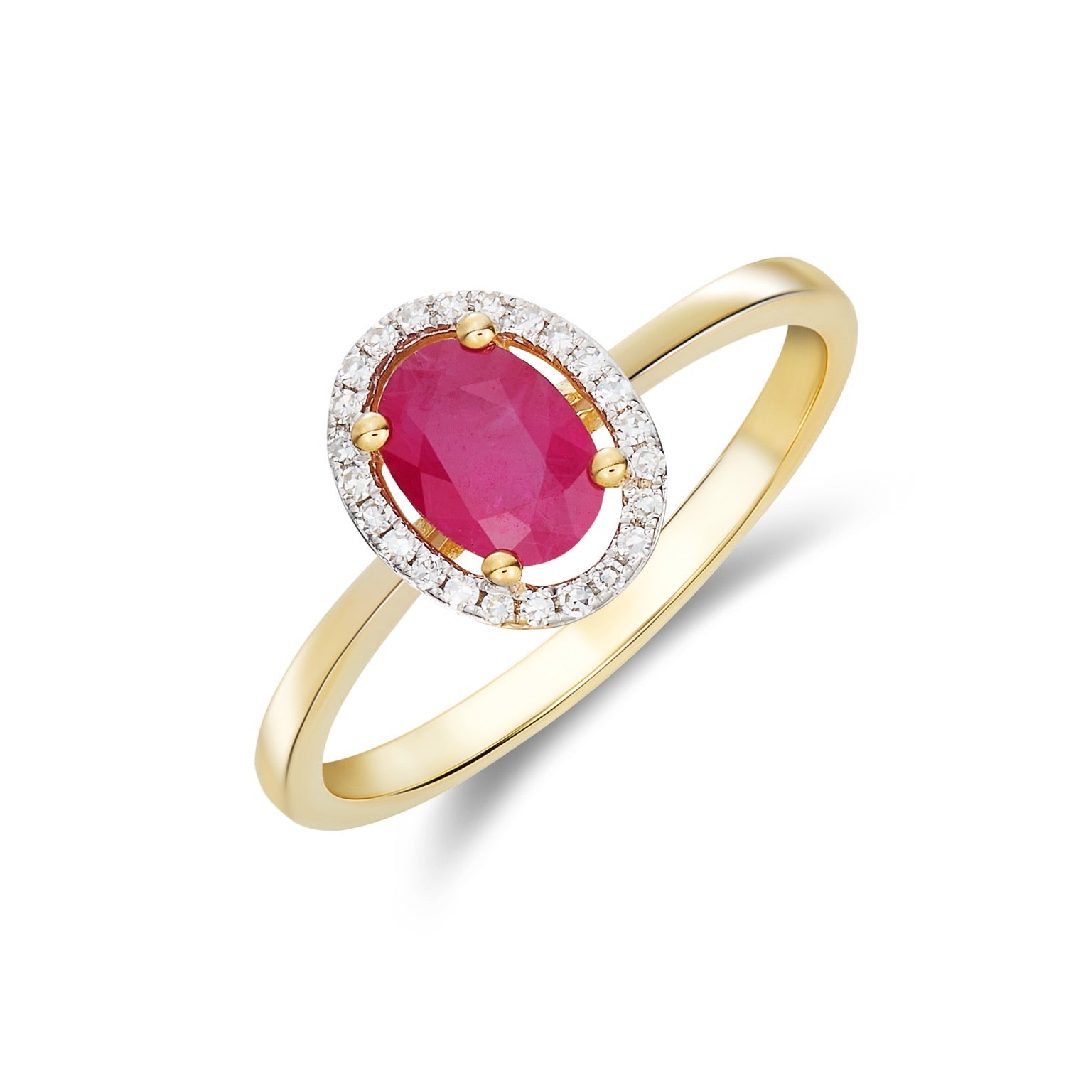 9CT Yellow Gold Oval Ruby & Diamond Halo Cluster Ring 7x5mm
