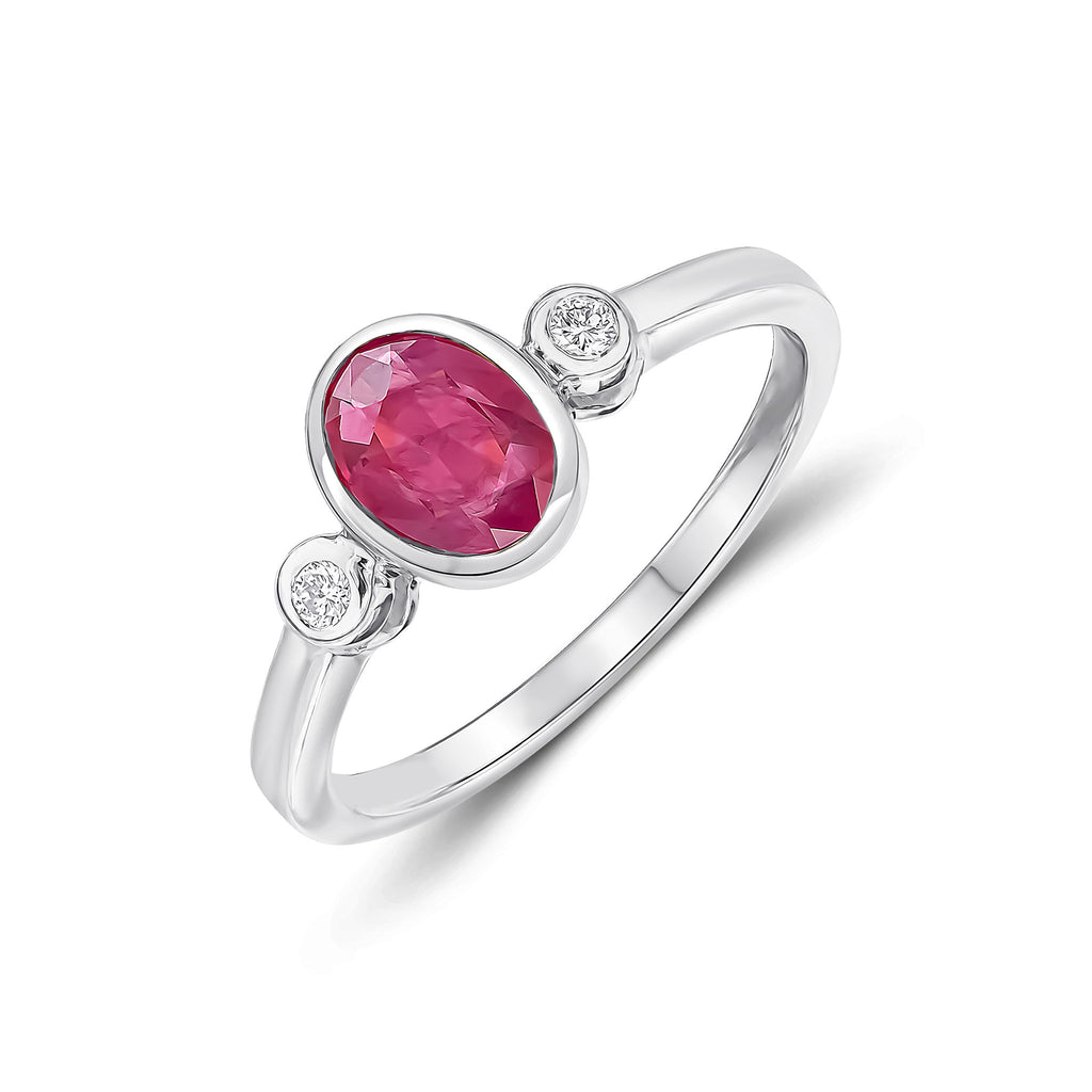 9CT White Gold Oval Ruby & Diamond Three Stone Rubover Ring