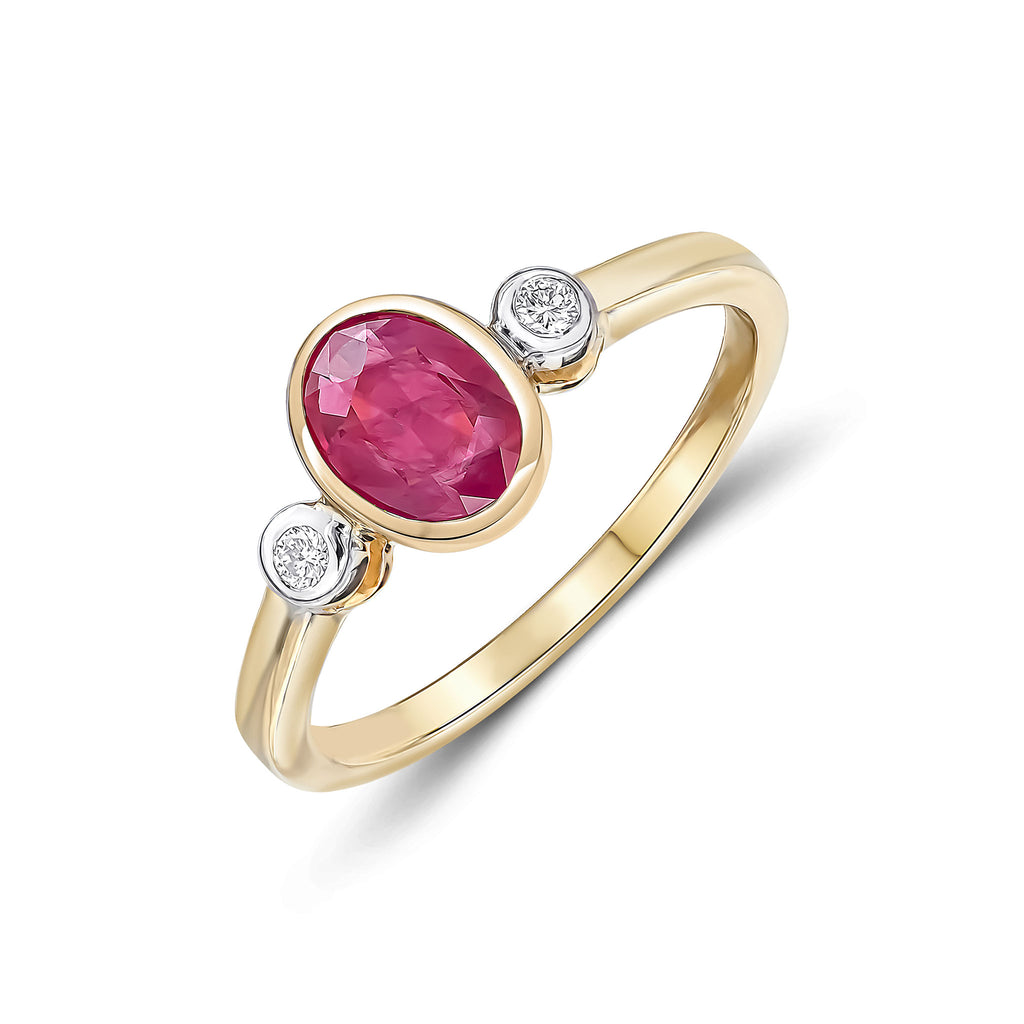 9CT Yellow Gold Oval Ruby & Diamond Three Stone Rubover Ring