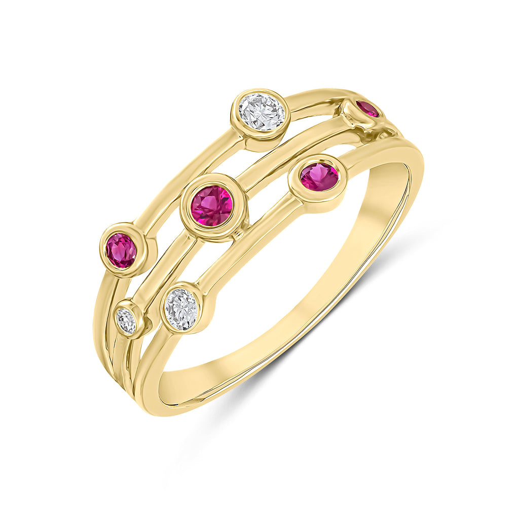 9CT Yellow Gold Round Ruby & Diamond Three Row Bubble Ring