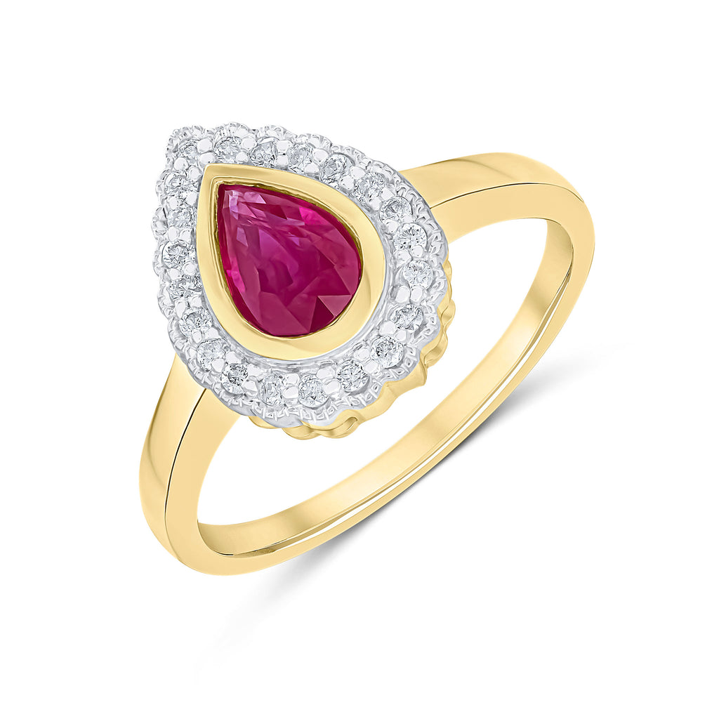 9CT Yellow Gold Rubover Pear Shaped Ruby & Millegrain Diamond Cluster Ring 7x5mm