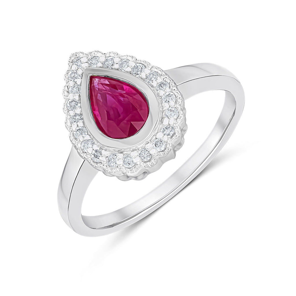 9CT White Gold Rubover Pear Shaped Ruby & Millegrain Diamond Cluster Ring 7x5mm