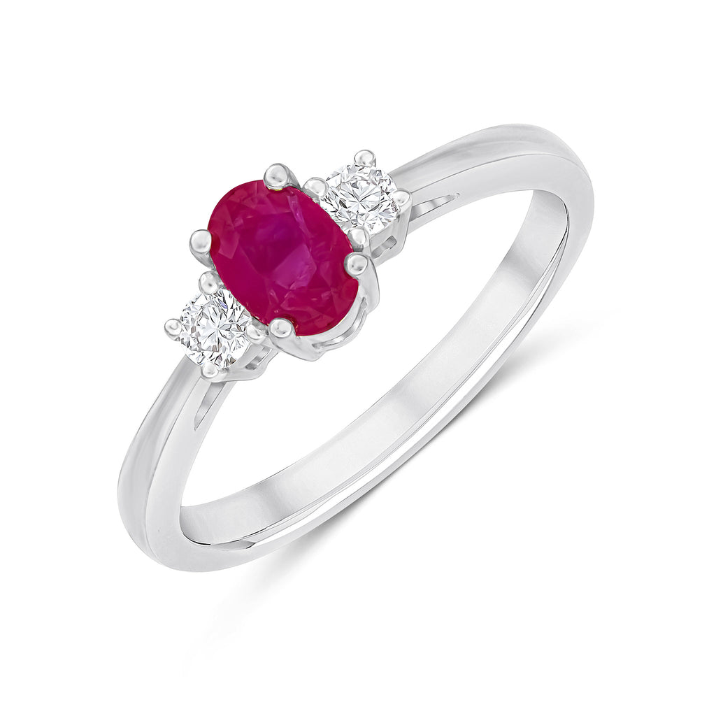9CT White Gold Oval Ruby & Diamond Claw Three Stone Ring 6x4mm