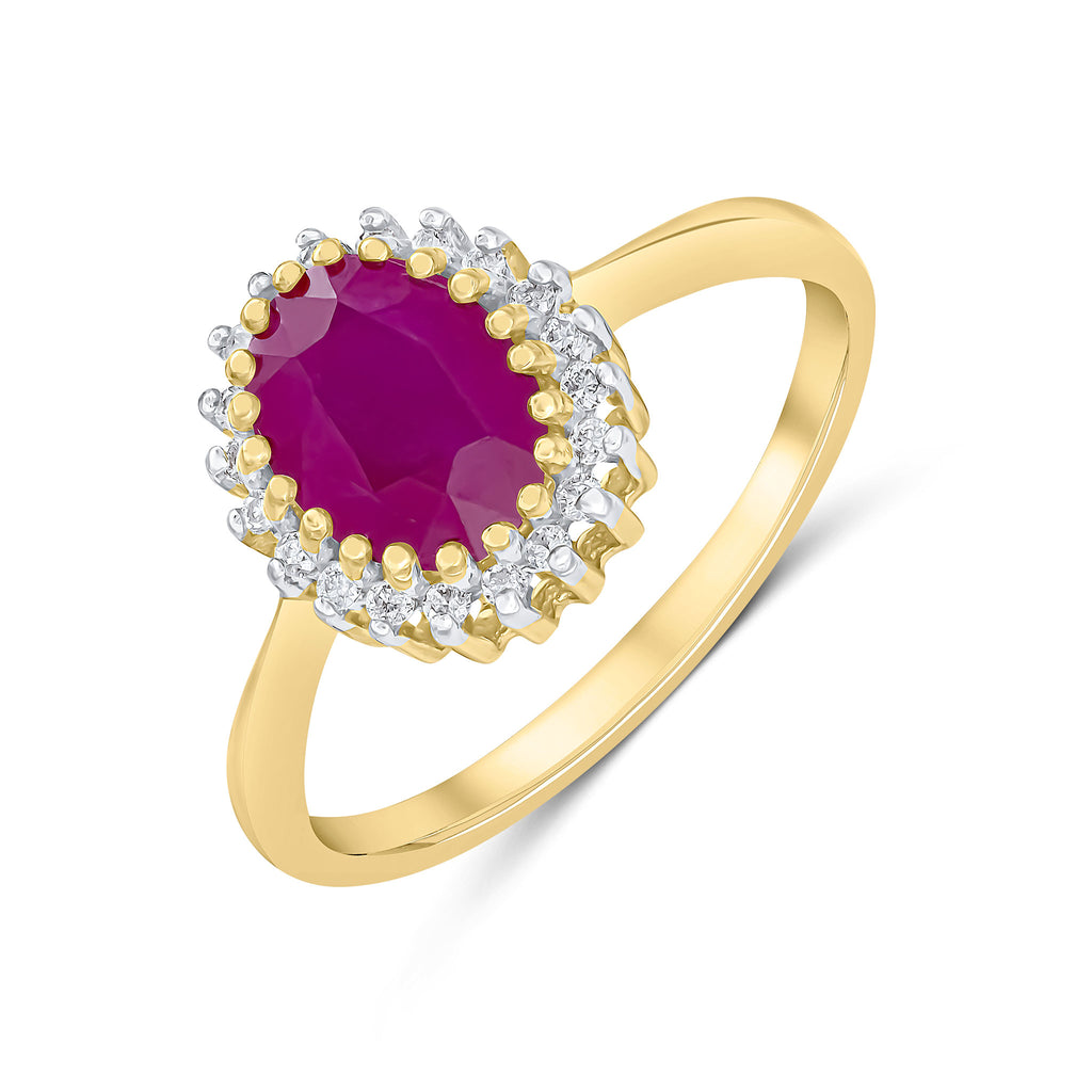 9CT Yellow Gold Rubover Oval Ruby & Millegrain Diamond Cluster Ring 7x5mm