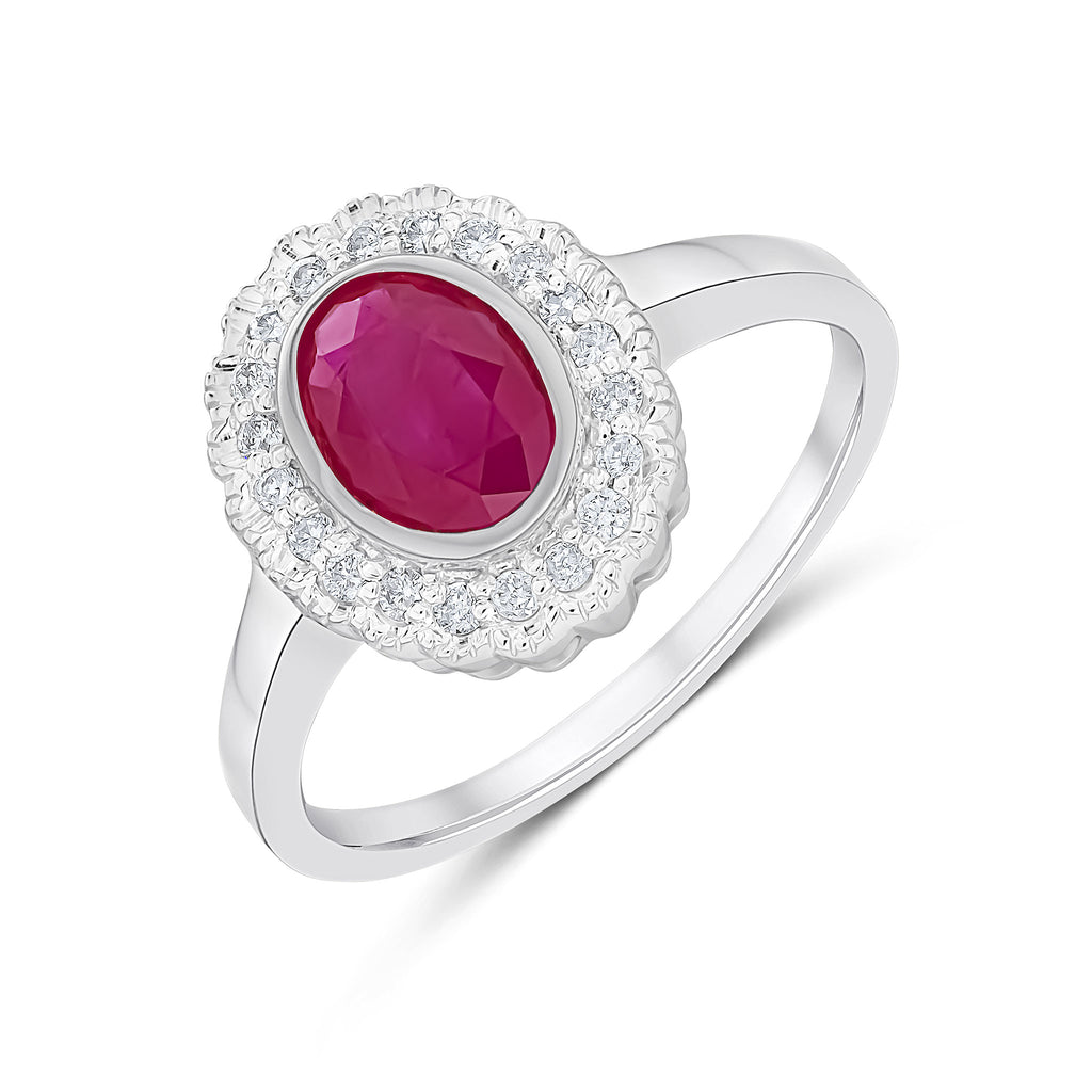 9CT White Gold Rubover Oval Ruby & Millegrain Diamond Cluster Ring 7x5mm
