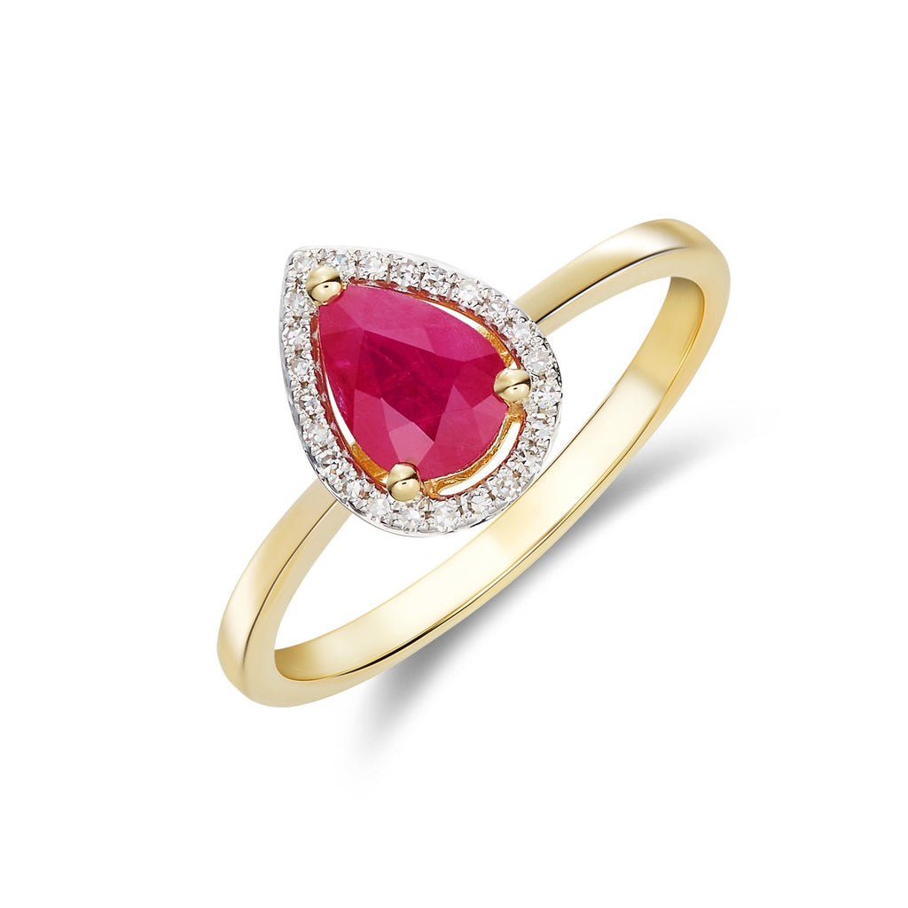 9CT Yellow Gold Pear Shaped Ruby & Diamond Halo Cluster Ring 7x5mm