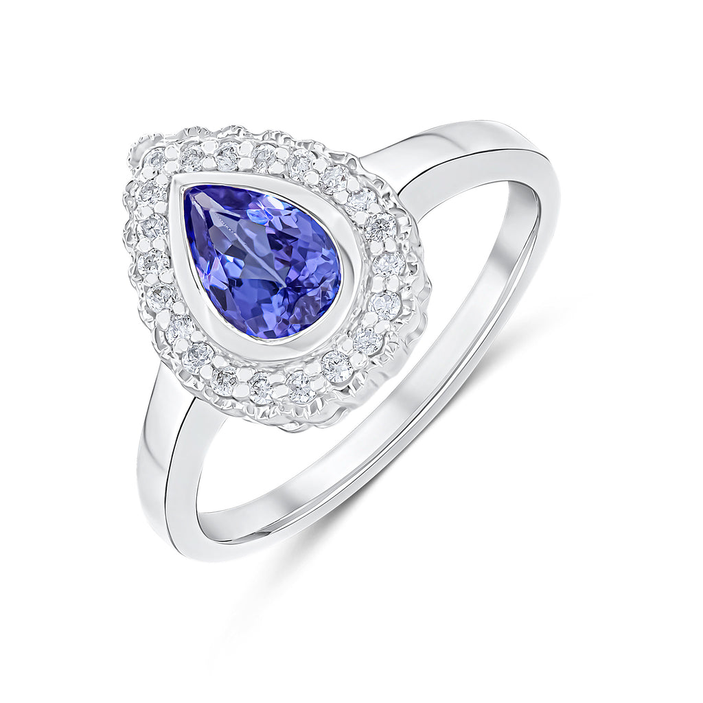 9CT White Gold Rubover Pear Shaped Tanzanite & Millegrain Diamond Cluster Ring 7x5mm