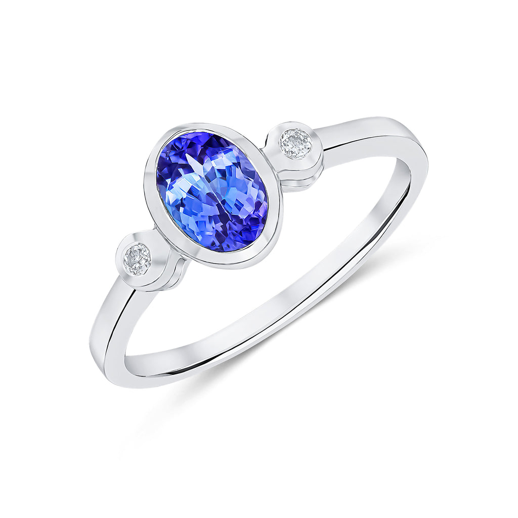 9CT White Gold Oval Tanzanite & Round Diamond Three Stone Rubover Ring