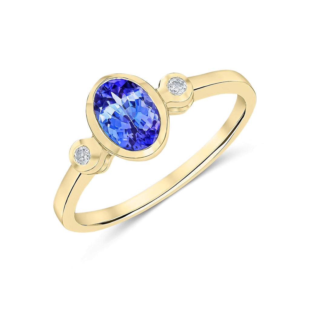 9CT Yellow Gold Oval Tanzanite & Round Diamond Three Stone Rubover Ring