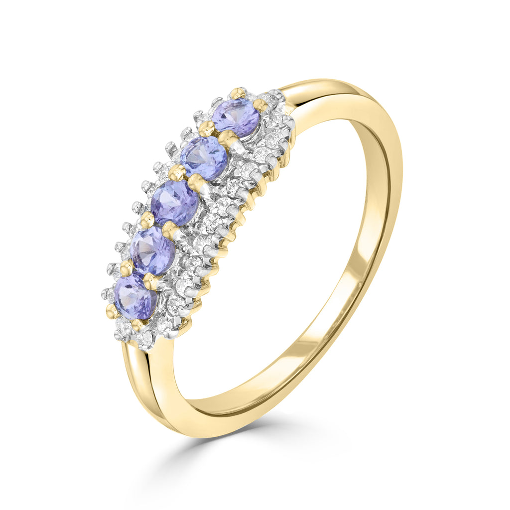 9CT Yellow Gold Round Tanzanite & Diamond 3 Row Ring