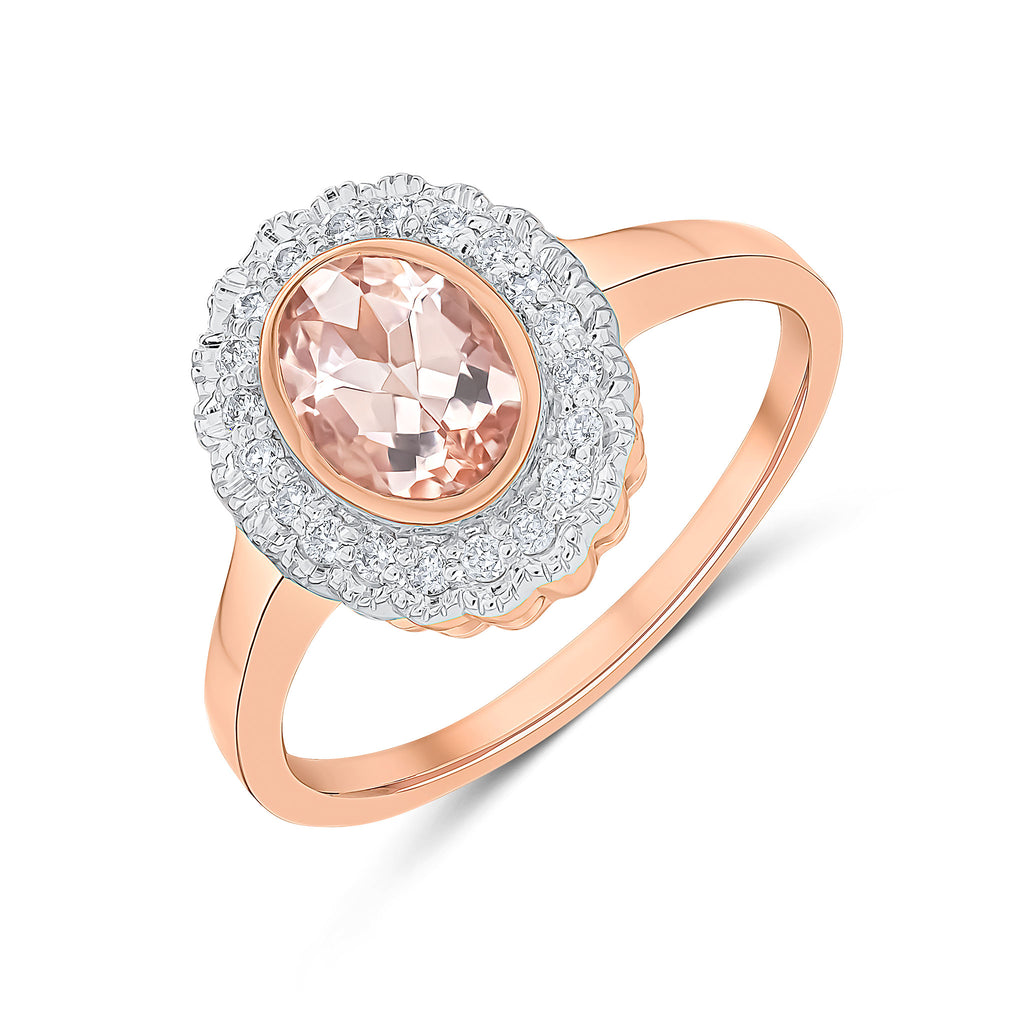 9CT Rose Gold Rubover Oval Morganite & Millegrain Round Diamond Cluster Ring 7x5mm