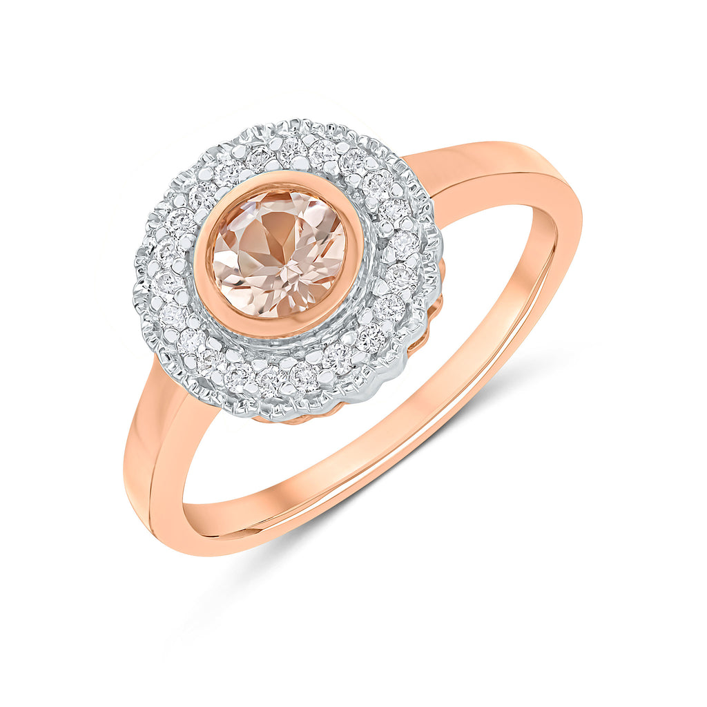 9CT Rose Gold Rubover Round Morganite & Millegrain Round Diamond Cluster Ring 5mm