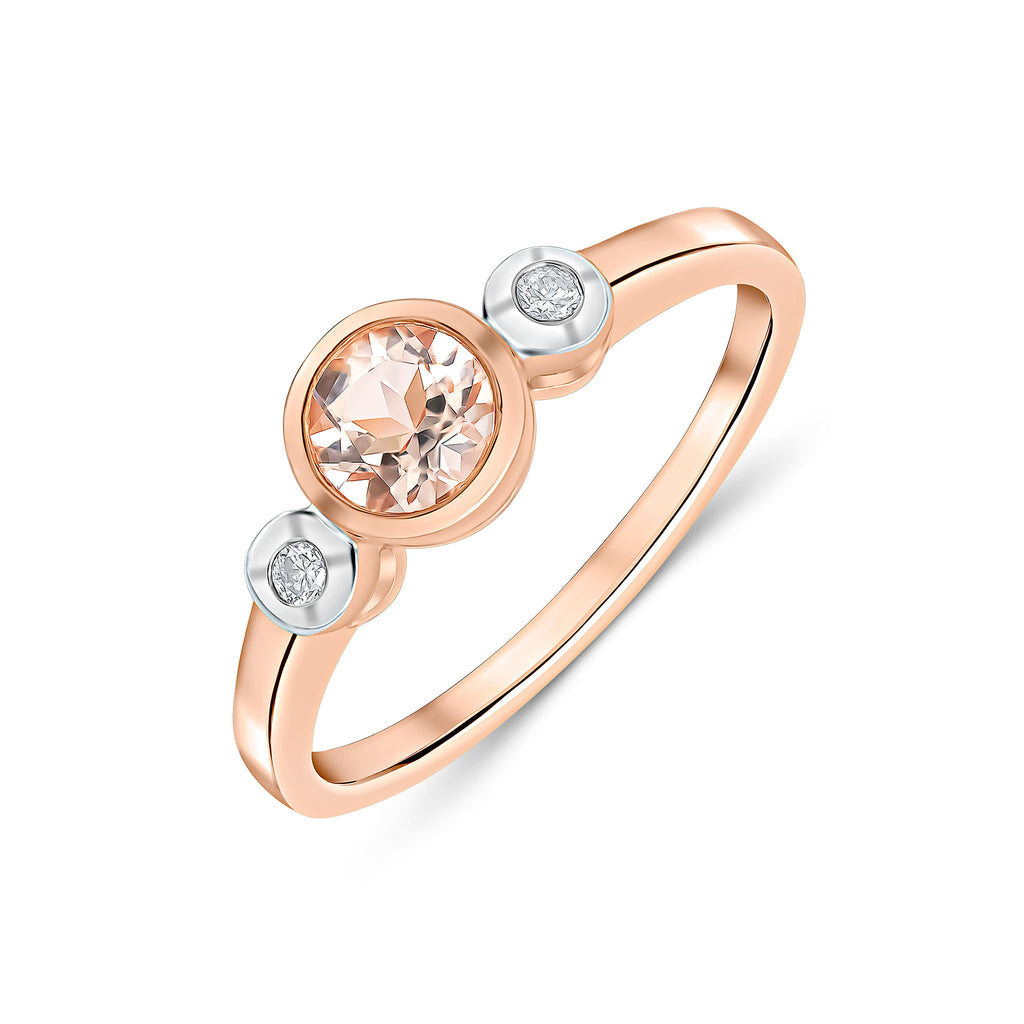 9CT Rose Gold Round Morganite & Diamond Three Stone Rubover Ring 5mm