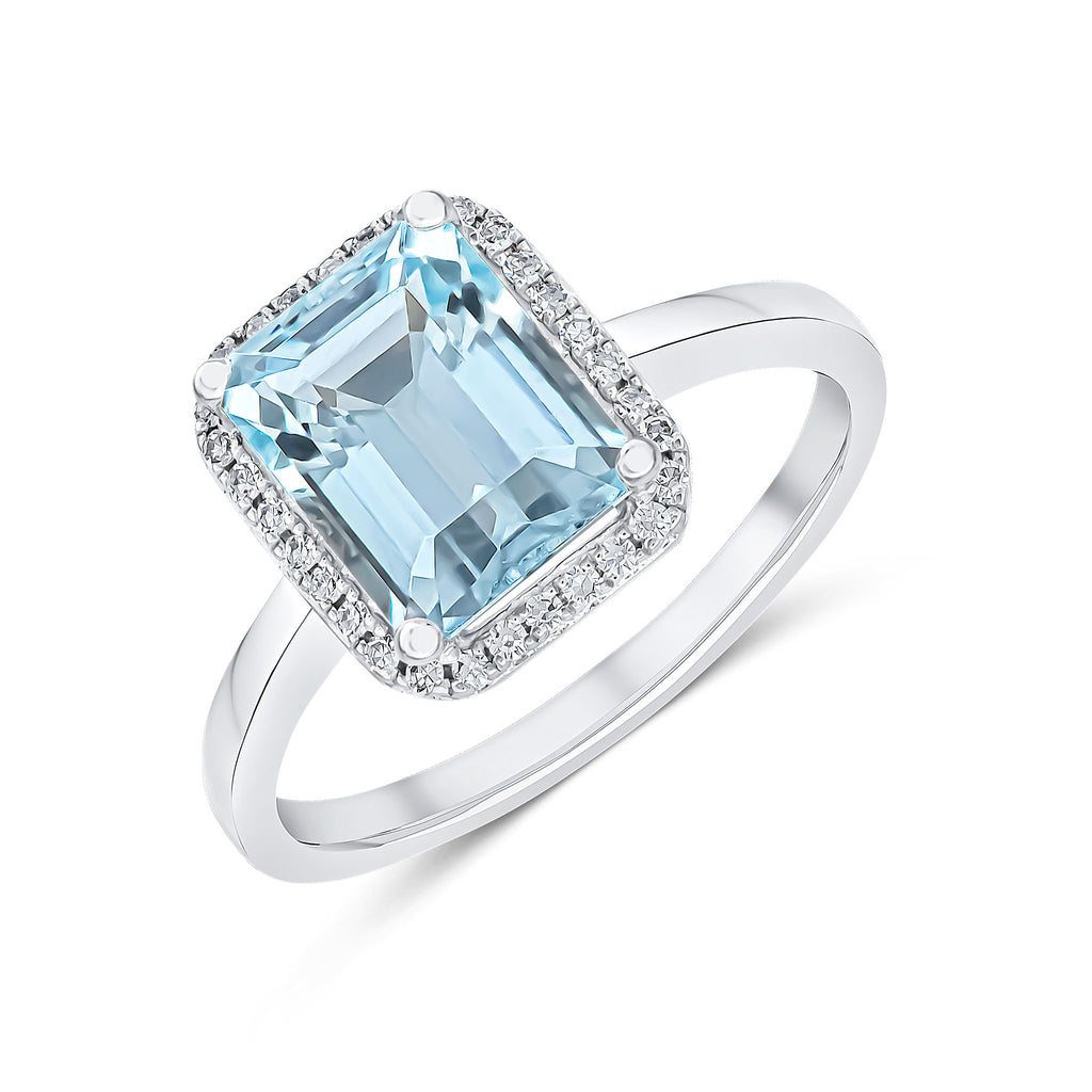 9CT White Gold Octagonal Rubover Aquamarine & Round Diamond Grain Set Cluster Ring 7x5mm