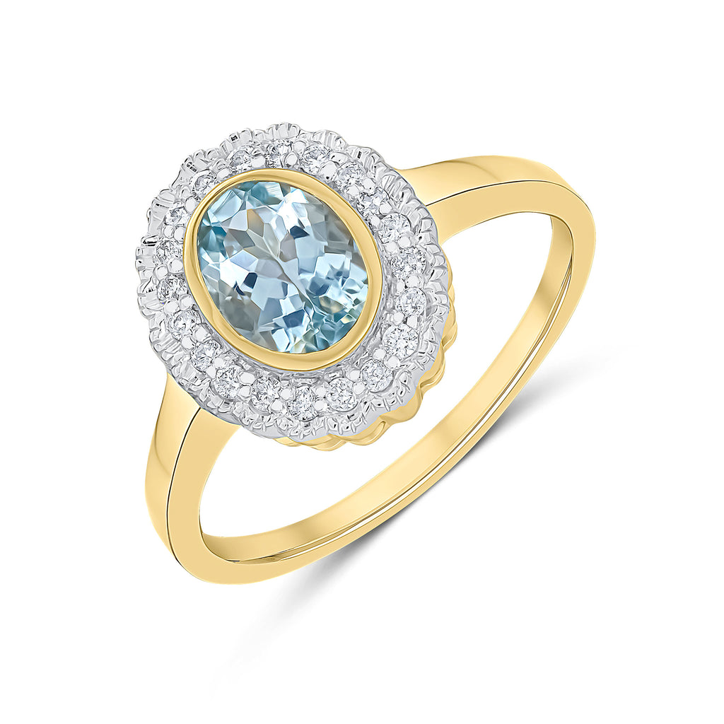 9CT Yellow Gold Rubover Oval Aquamarine & Millegrain Diamond Cluster Ring 7x5mm