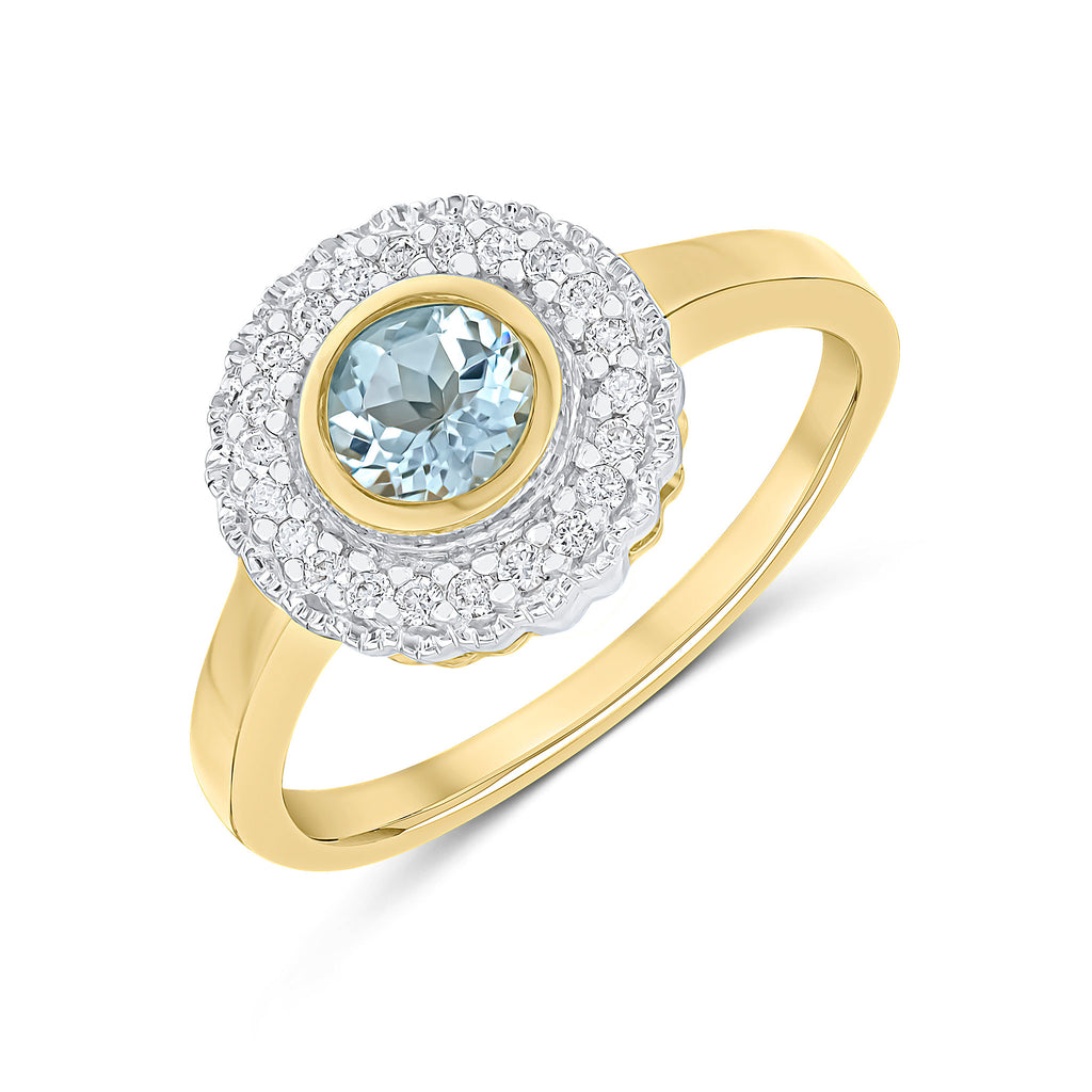 9CT Yellow Gold Rubover Round Aquamarine & Millegrain Diamond Cluster Ring 5mm