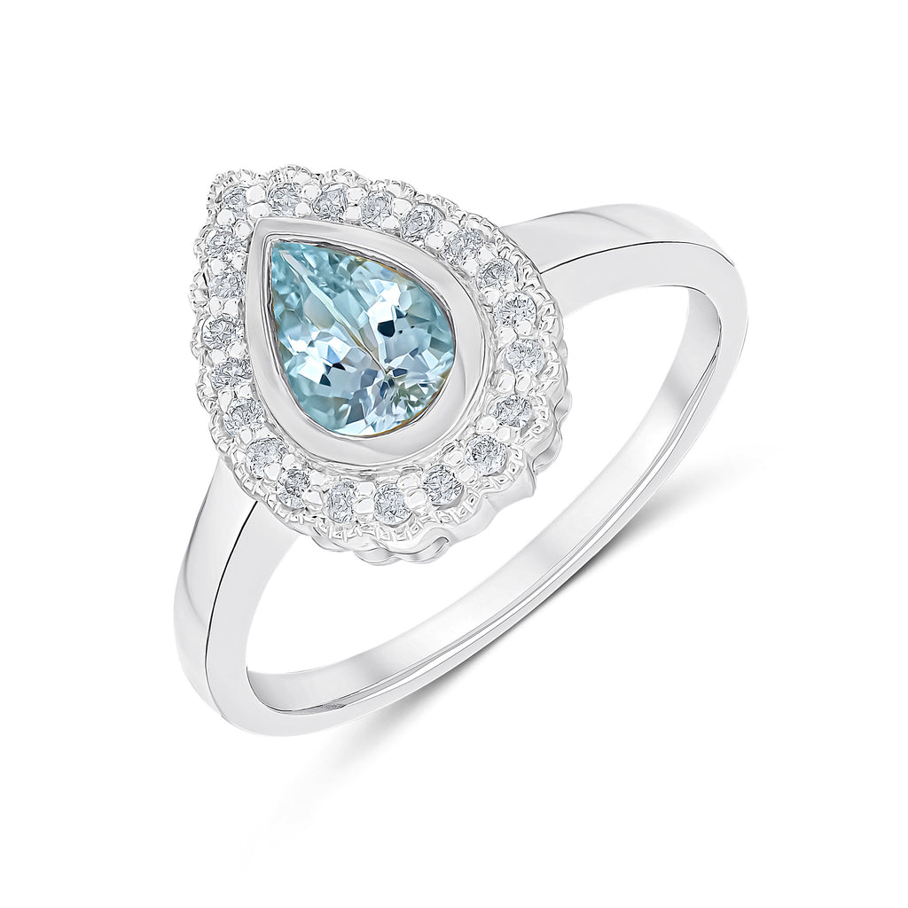 9CT White Gold Rubover Pear Shaped Aquamarine & Millegrain Diamond Cluster Ring 7x5mm