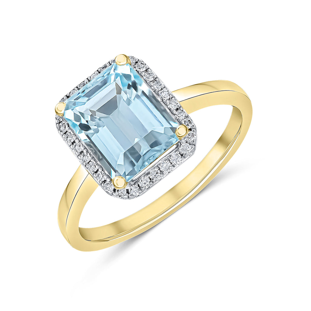 9CT Yellow Gold Octagonal Rubover Aquamarine & Round Diamond Grain Set Cluster Ring 7x5mm