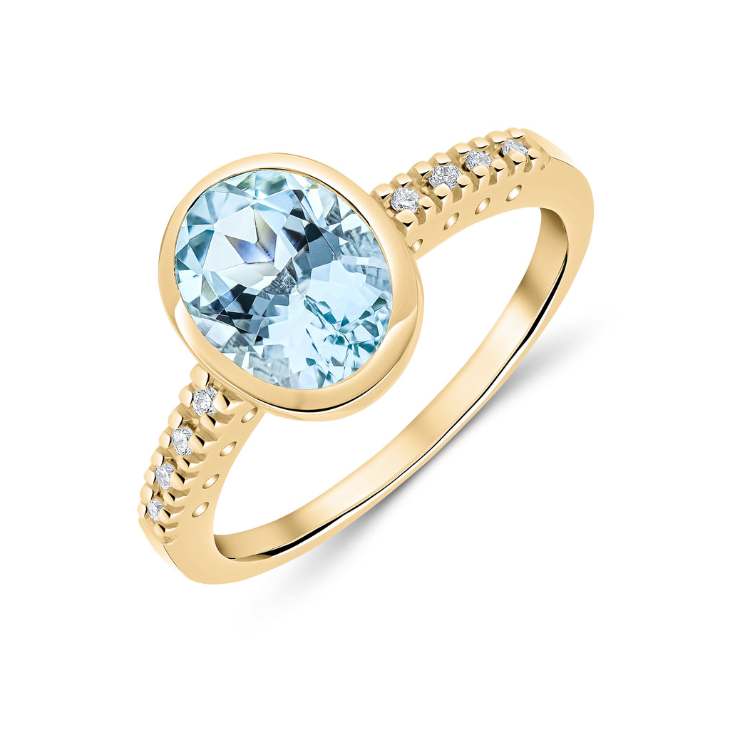 9CT Yellow Gold Oval Rubover Aquamarine Ring with Diamond Shoulders 8x6mm