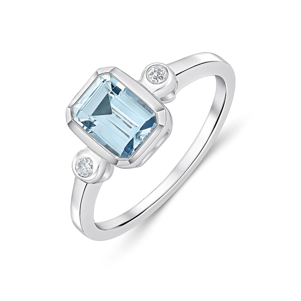9CT White Gold Octagonal Aquamarine & Diamond Three Stone Ring