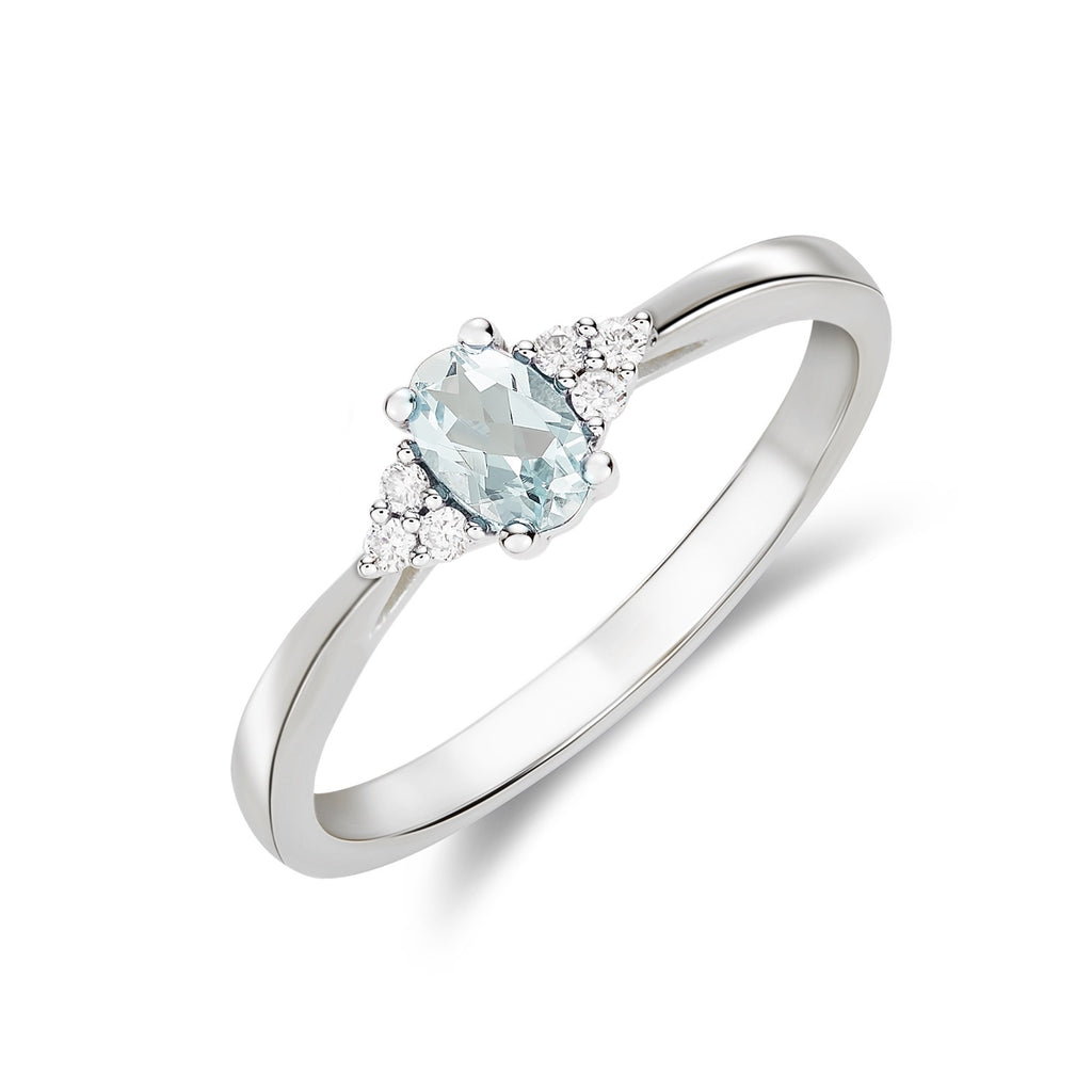 9CT White Gold Oval Rubover Aquamarine Ring with Diamond Shoulders 8x6mm