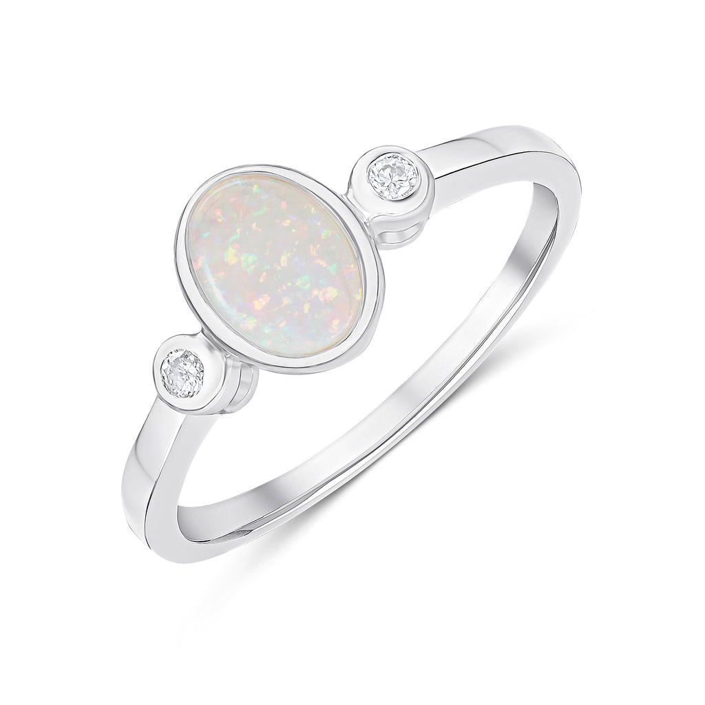 9CT White Gold Oval Opal & Diamond Three Stone Rubover Ring