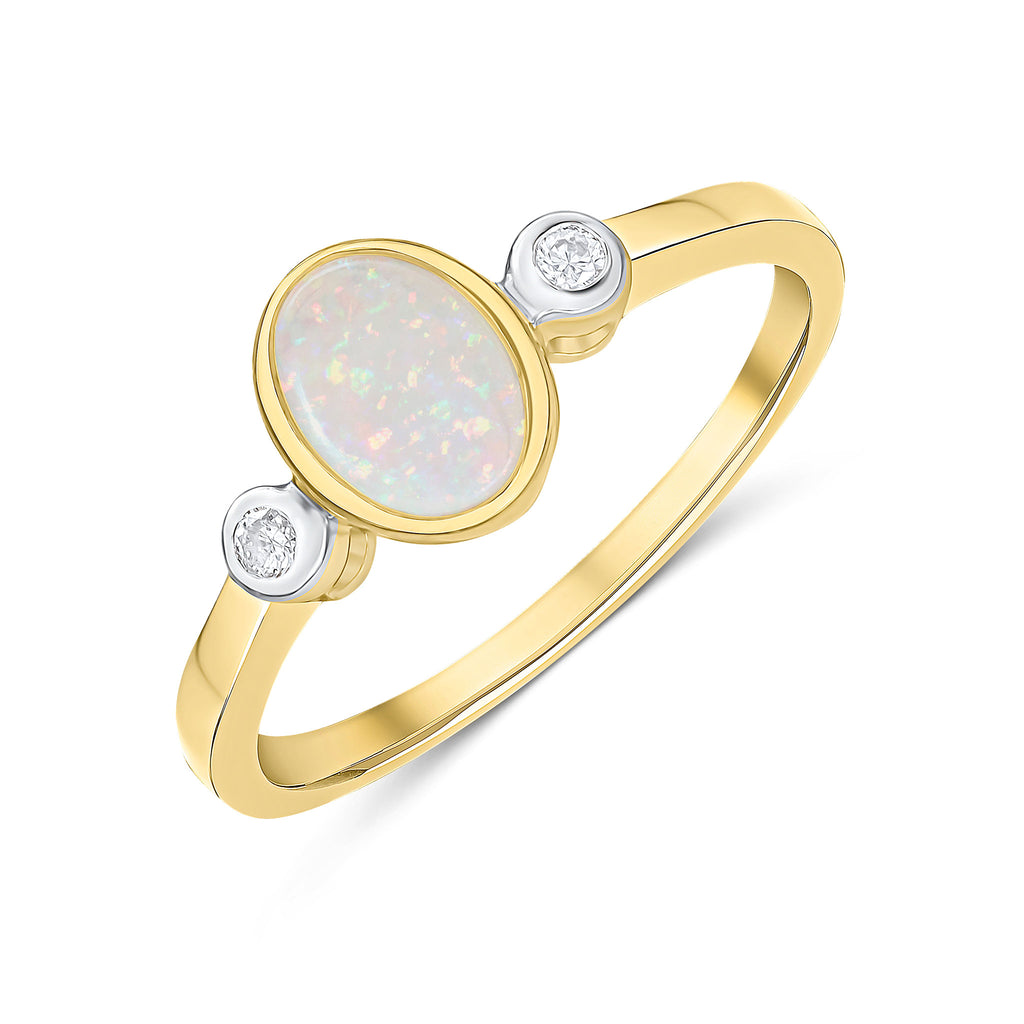 9CT Yellow Gold Oval Rubover Opal Ring with Diamond Shoulders 8x6mm