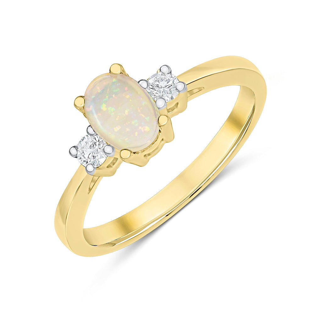 9CT Yellow Gold Oval Opal & Round Diamond Claw Three Stone Ring 6x4mm