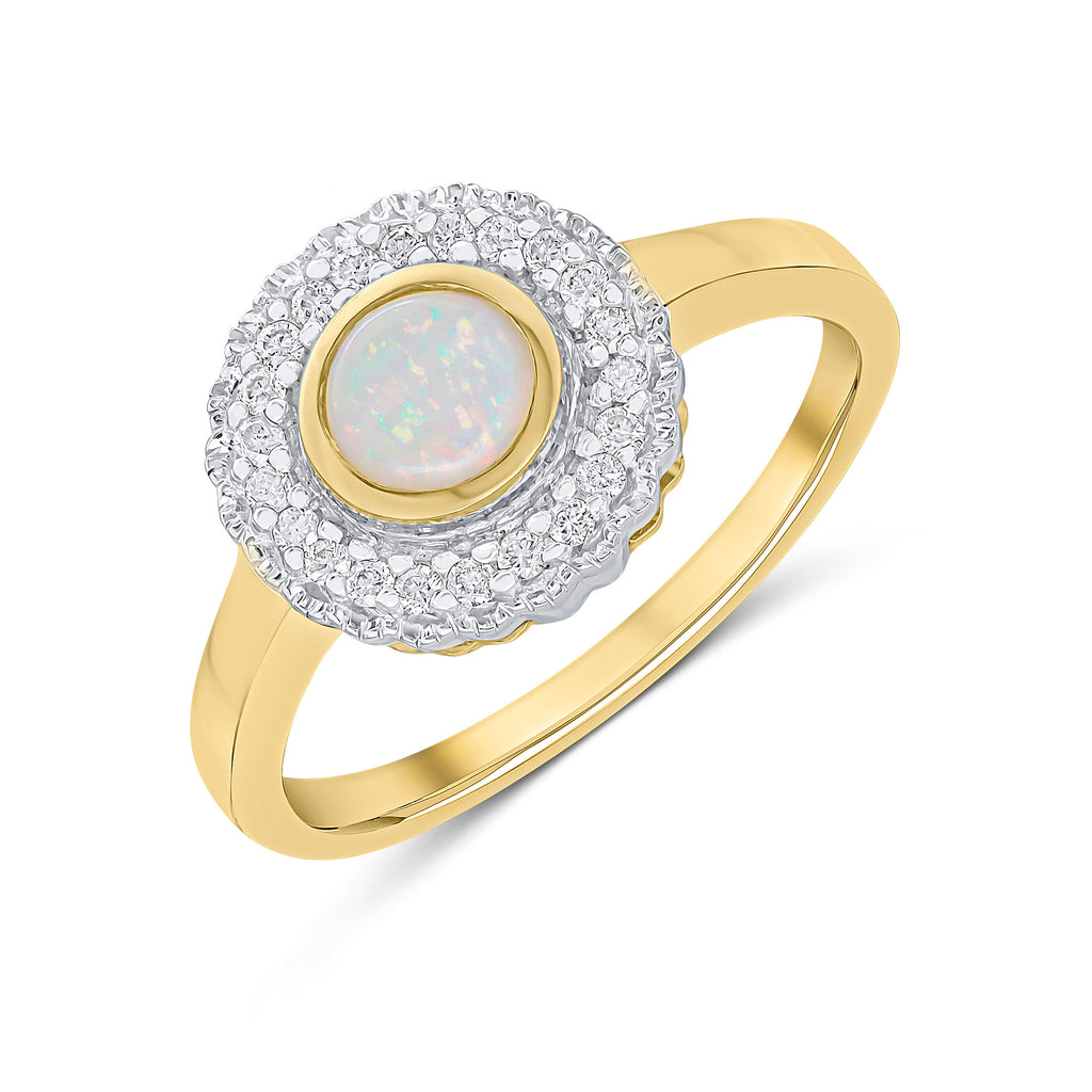9CT Yellow Gold Round Rubover Opal & Millegrain Round Diamond Cluster Ring 5mm