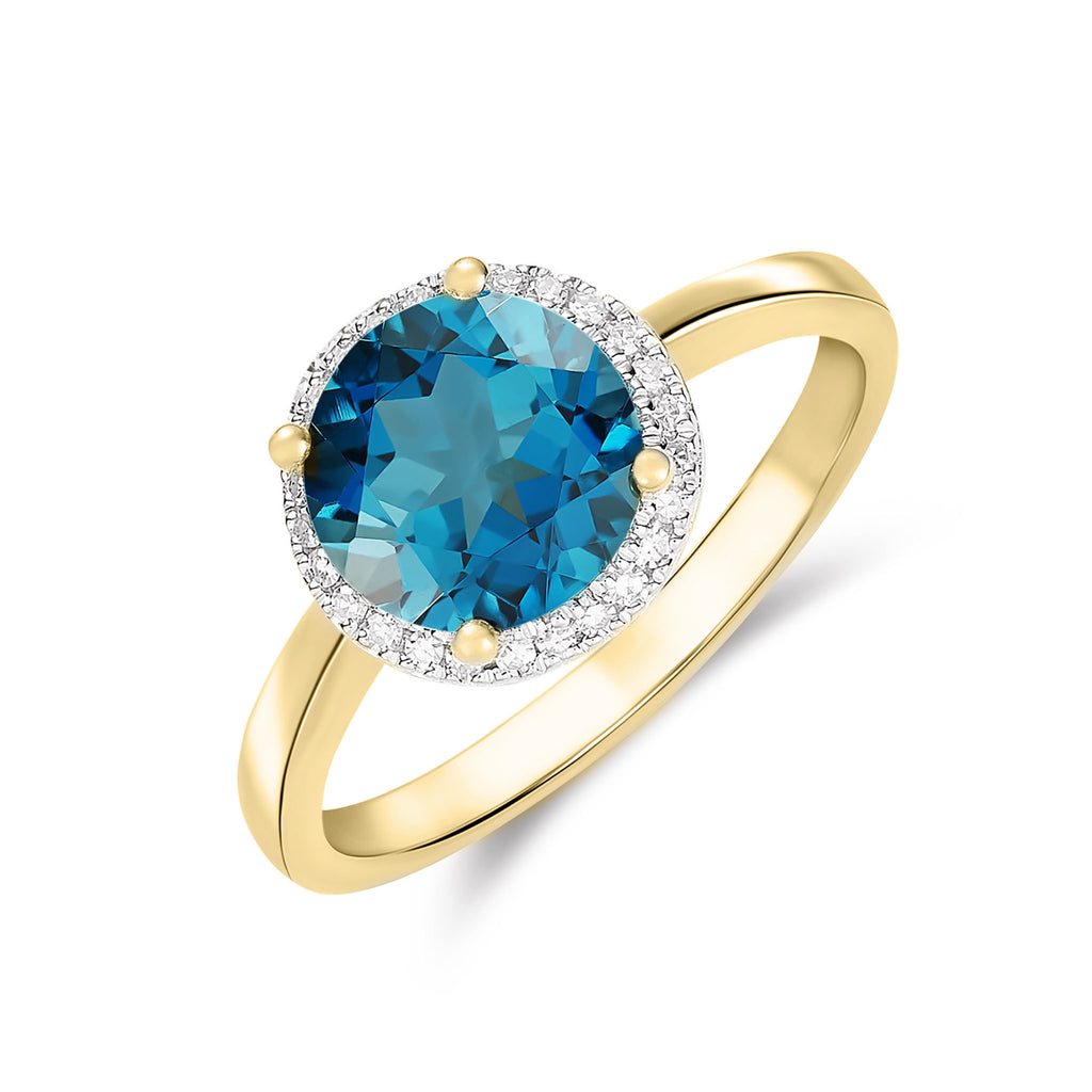 9CT Yellow Gold Round London Blue Topaz & Diamond Cluster Ring 8mm