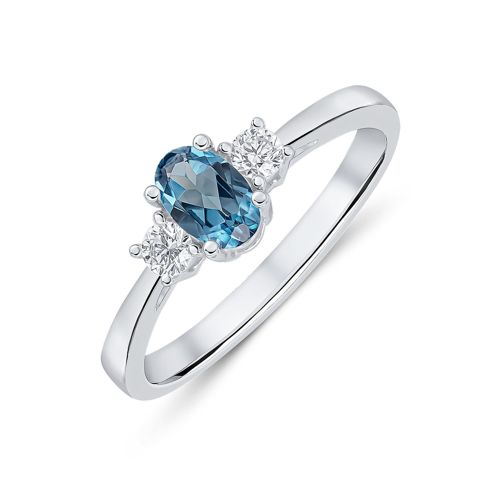 9CT White Gold Oval London Blue Topaz & Round Diamond Claw Three Stone Ring 6x4mm