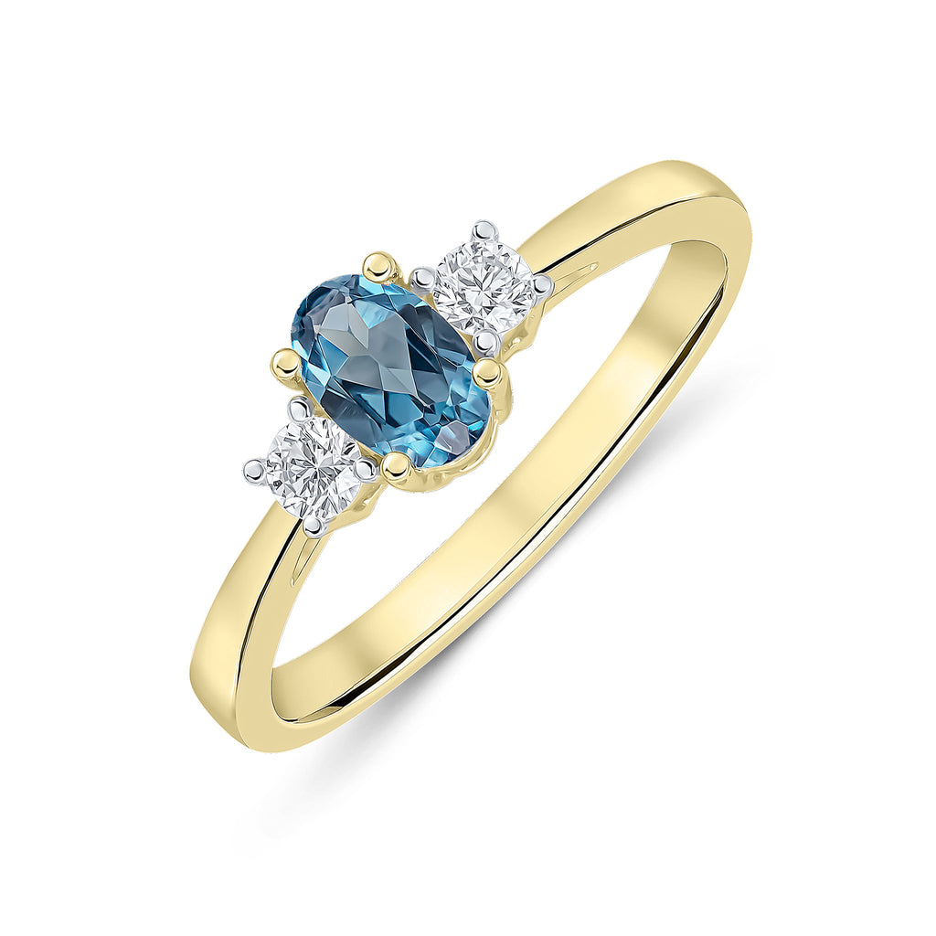 9CT Yellow Gold Oval London Blue Topaz & Round Diamond Claw Three Stone Ring 6x4mm
