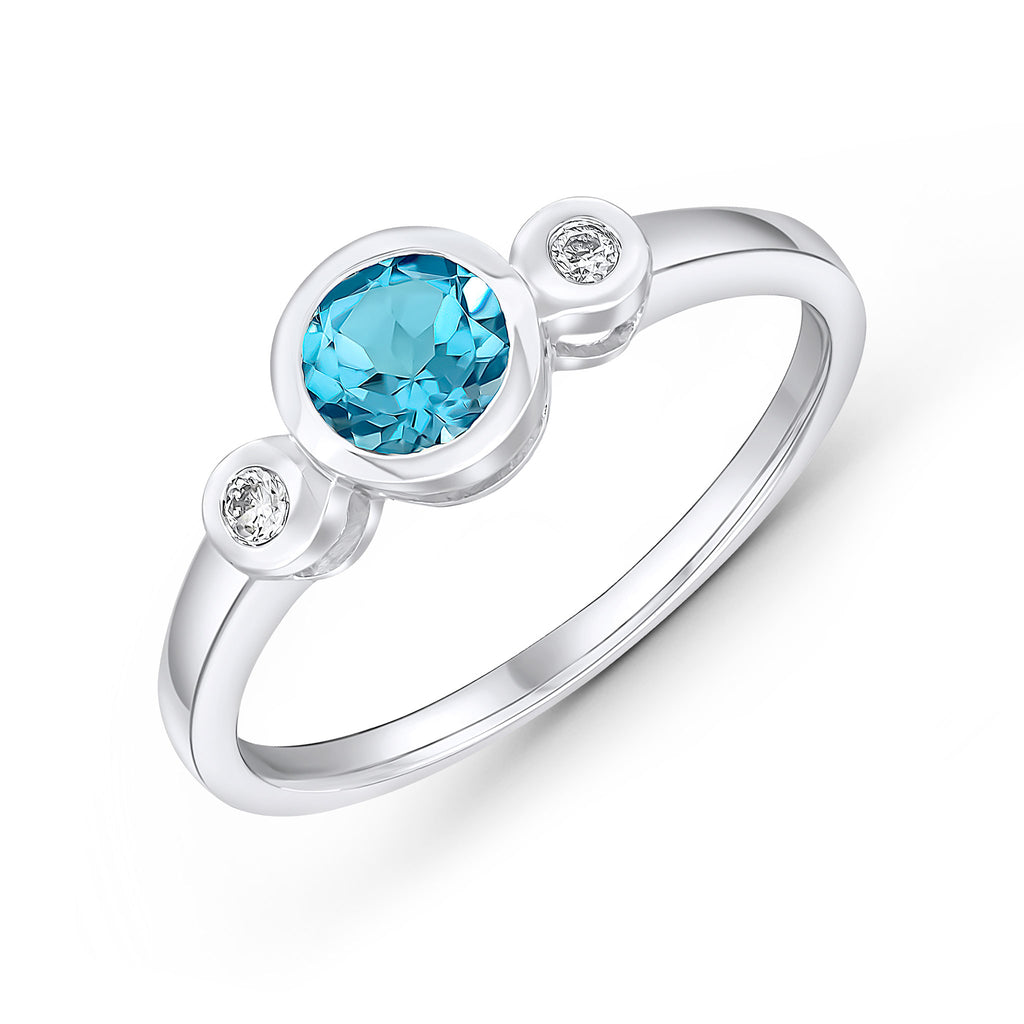 9CT White Gold Round Swiss Blue Topaz & Diamond Three Stone Ring 5mm