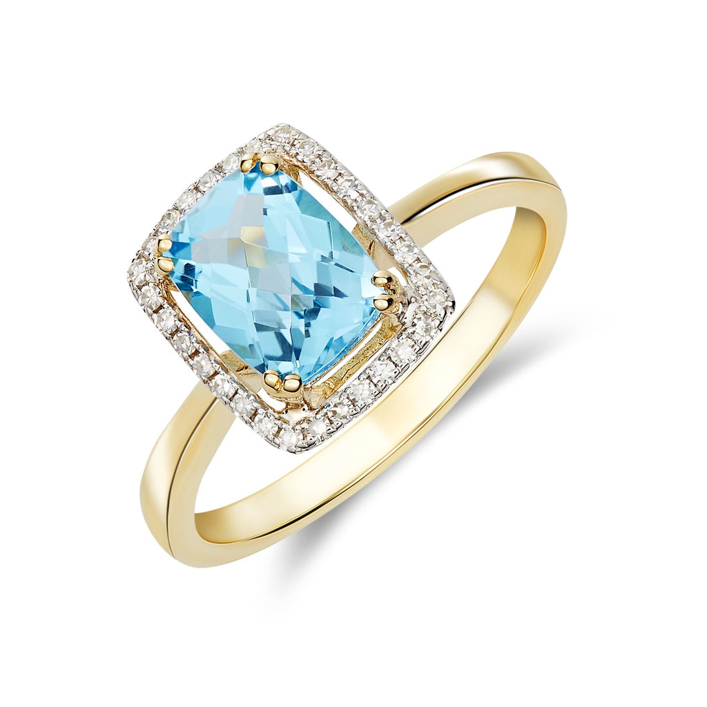 9CT Yellow Gold Cushion Swiss Blue Topaz & Diamond Cluster Ring 10mm