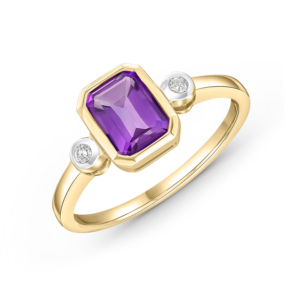 9CT Yellow Gold Octagonal Amethyst & Diamond Three Stone Ring 7x5mm