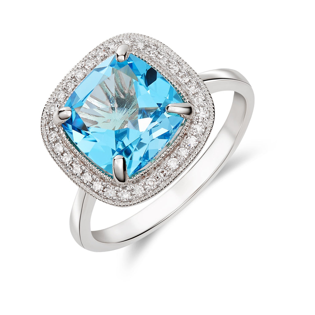9CT White Gold Cushion Swiss Blue Topaz & Diamond Cluster Ring 8mm