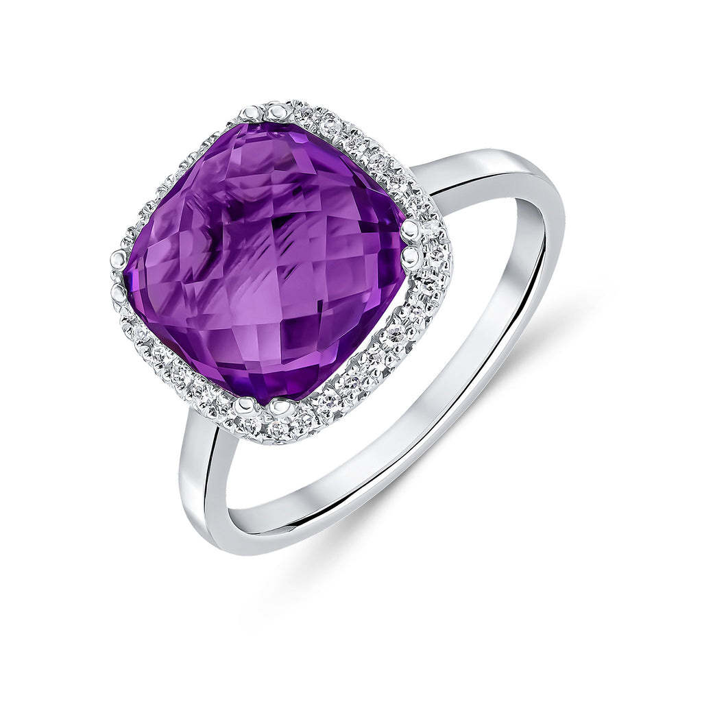 9CT White Gold Cushion Amethyst & Diamond Cluster Ring 10mm